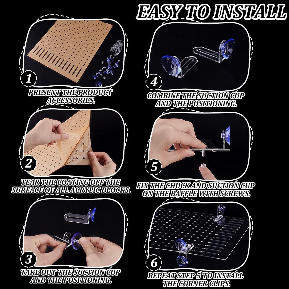 Specifications: Material: Acrylic Color: Clear Quantity: 1 Set Size: Board: 400x300x2mm, hole: 5mm and 50x5mm, 1pc; V Shape: 52x31x20mm, hole: 15x9.5mm and 37x4.5mm, 9pcs; Suction Cup: 30x10mm, 8pcs; Nut: 7x8x3.5mm, hole: 3.5mm, 5pcs; Screw: 15x7mm, 5pcs.