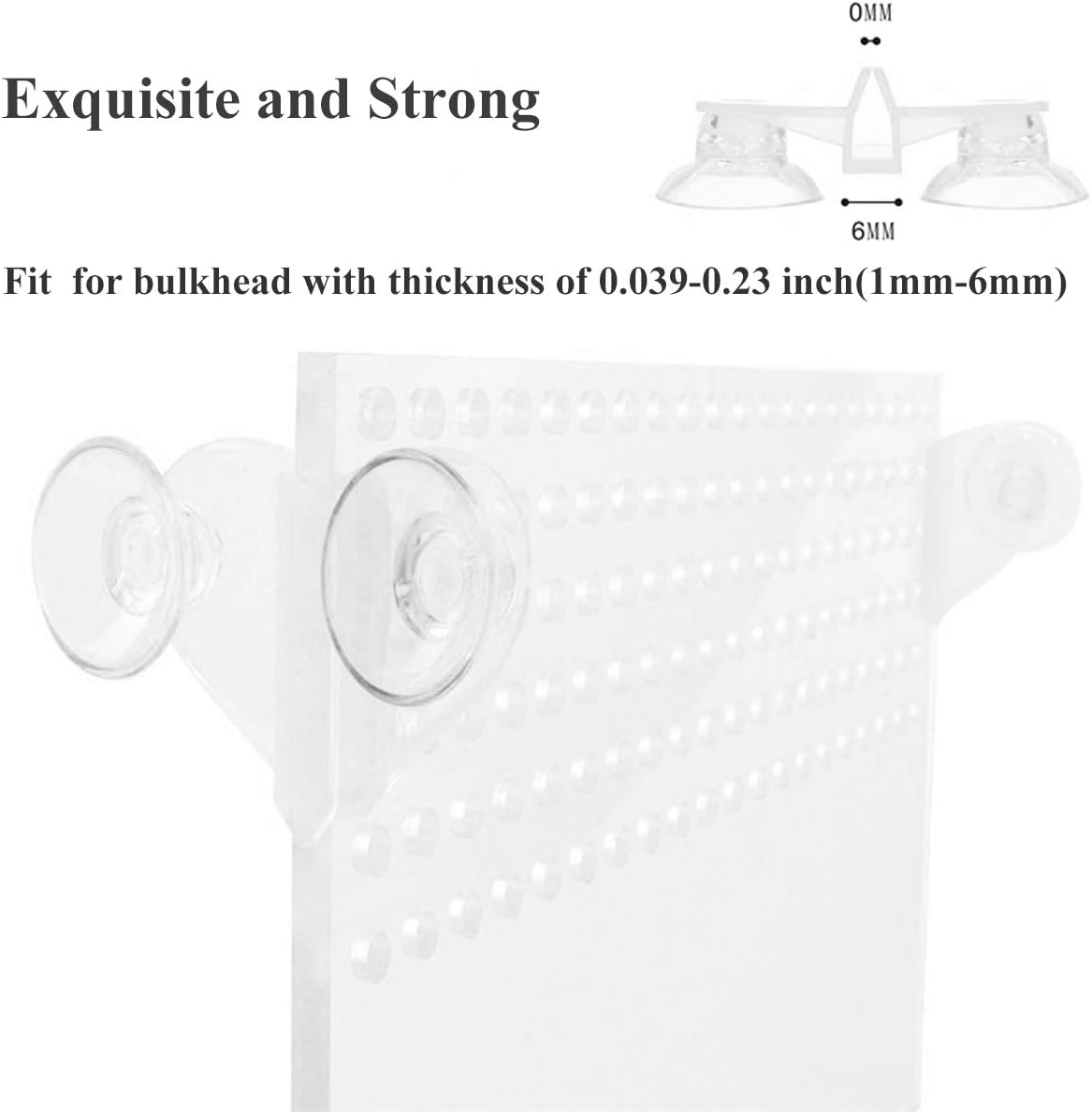 JZMYXA Aquarium Fish Tank Divider Suction Cup Easy to install in your aquarium fish tank. Suction cup based aquarium divider holders. You can easily divide your fish tank into several compartments with these divider holders. Use these divider holders for separations of different fish, for breeding and to prevent your fish to fight as well. Material: Plastic and Rubber Color : White+clear Suction cup dia:1.14 inches/29 mm. Fit Glass Thickness: 0.2” Size: 1.69" x 2" (L X W) Package: 4 Pieces Suction Cup Divider Holder
