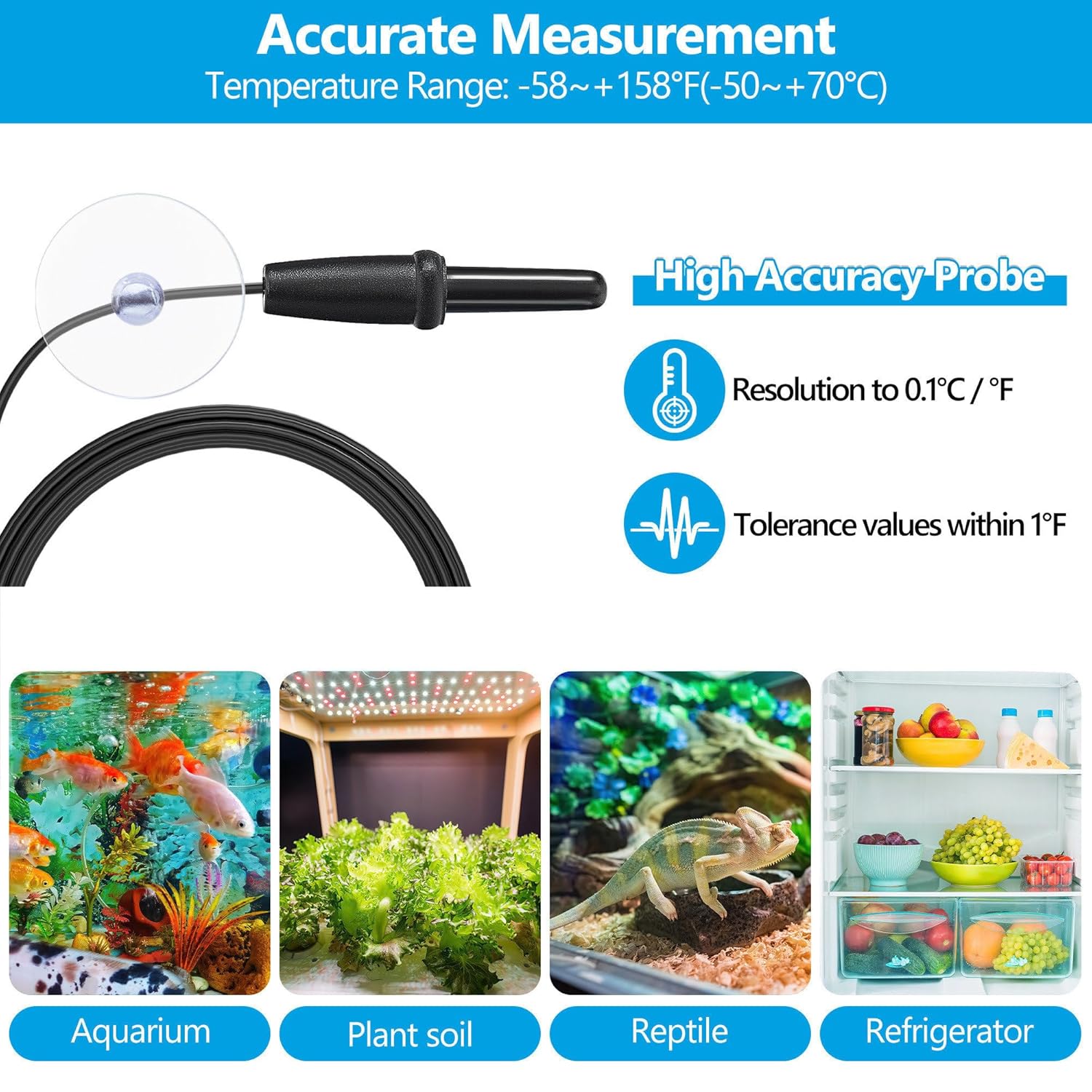 The Best Aquarium Thermometer For Your NeedsSpecification:Temperature Measurement Accuracy: ±1℉;Temperature Range: -58~ +158℉(-50~ +70℃);Power Cord: 3.2 ft (0.97m)Thermometer Size: 2.16 *1.38 inSuction Cup : 2 pack Power Supply: LR44 battery (included)Features:- Accurate Measurement- Easy To Read- Simple To Use- Easy Installation- One Year Warranty And 24 Hours Professional Customer ServiceWhy Choose DaToo Aquarium Thermometer? 1.Accurate Measurement: DaToo Fish Tank Thermometer utilizes a high-precision stainless steel sensing probe with a wide temperature measurement range to provide accurate water temperature data in a variety of environments.2. Easy To Read: DaToo digital thermometer is equipped with a large LCD display, presenting water temperature data in clear fonts and supporting free conversion of ℉/℃ units to meet individual preferences.3.Simple To Use: DaToo reptile thermometer simply places the probe gently into the water and starts measuring the temperature. The one-touch switch design and sturdy suction cup design ensure accurate and convenient temperature measurement.4.Easy Installation: DaToo aquarium thermometer is extremely easy to install and can be fixed in just a few seconds. We've also included durable button batteries that work right out of the box.5.We provide one year warranty and 24 hours professional customer service. Buy With Confidence!Select DaToo Products= Own A Private Aquarium Housekeeper.JUST DO IT, Let’t Go!!