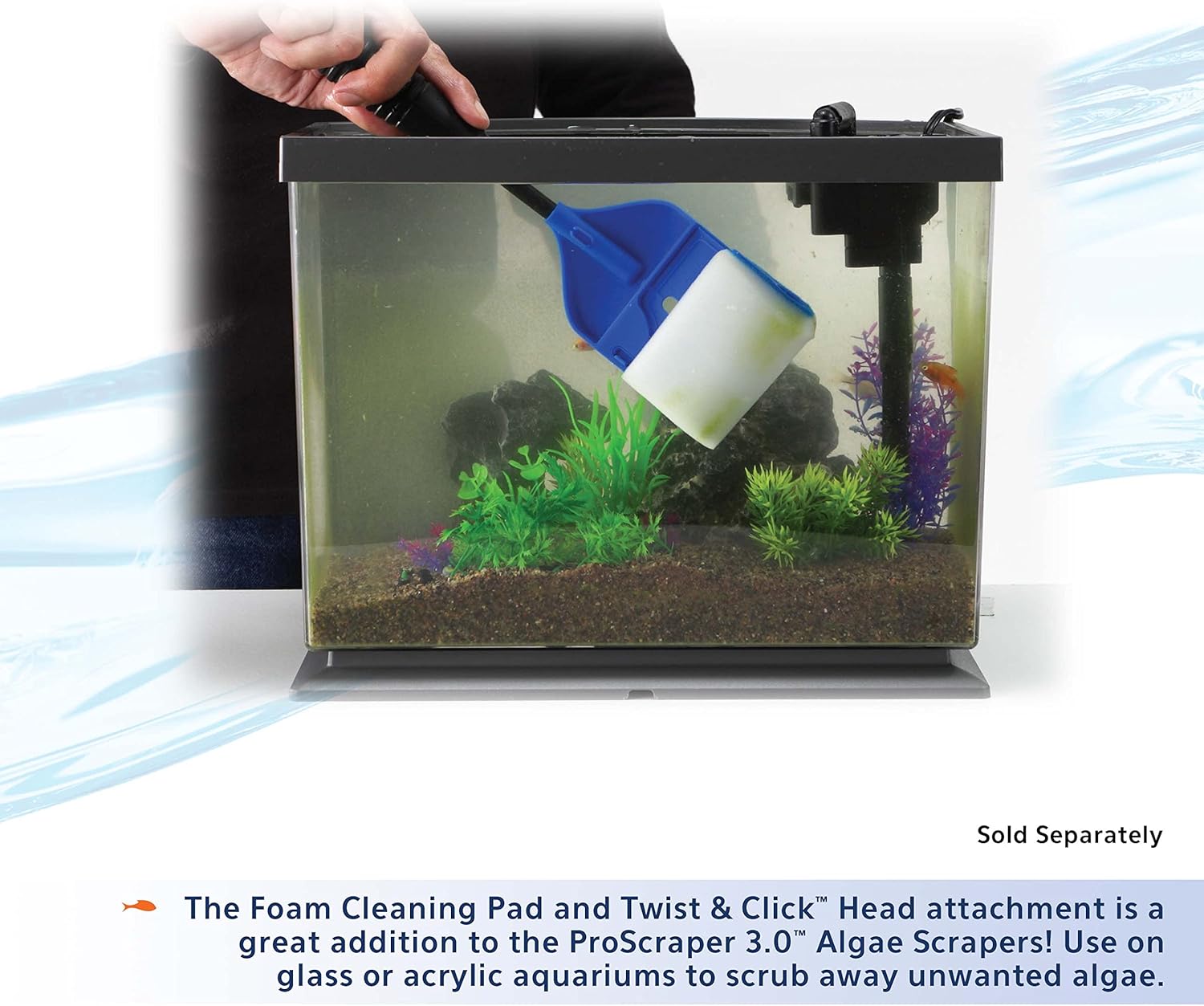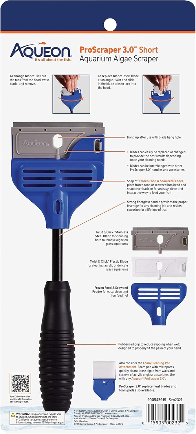 The information below is per-pack only Twist & Click Stainless Steel Replacement Blade is great for cleaning hard to remove buildup from glass aquariums and is rust resistant Twist & Click Plastic Replacement Blade is made of softer material to reduce the risk of scratching walls and is great for acrylic or delicate glass Snap off Frozen Food & Seaweed Feeder, place frozen food or seaweed into head and snap cover back on for feeding Blades can easily be replaced or changed with Twist & Click design Rubberized grip to reduce slipping when wet; designed to properly fit the palm of your hand Strong fiberglass handle provides the proper leverage for any cleaning job and resists corrosion for a lifetime of use Hang holes for easy storage › See more product details