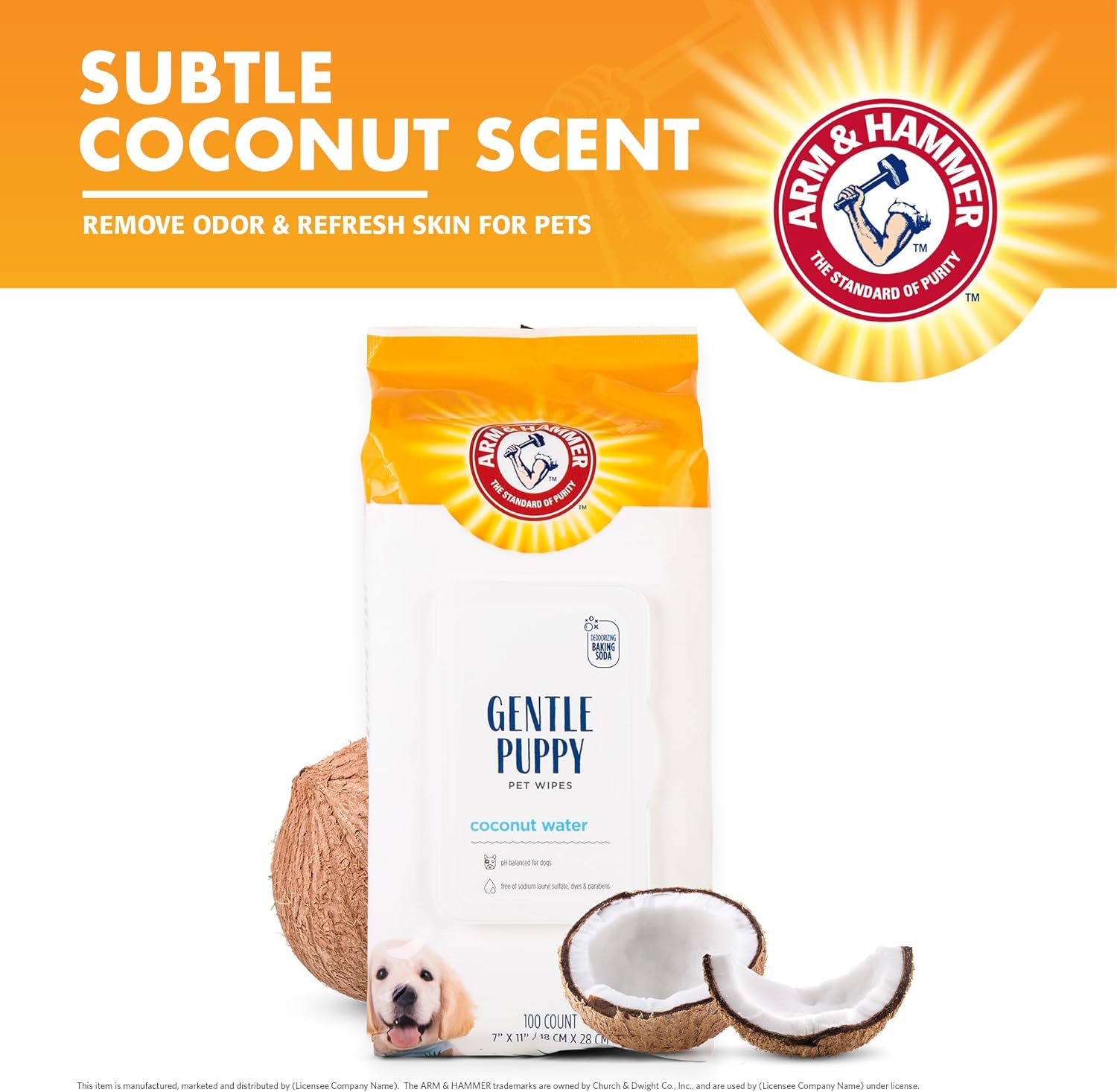 Arm & Hammer Pet Wipes: The Gentle, Effective Choice for Your Puppy Keep your pup clean and fresh with Arm & Hammer pet wipes, the trusted name in dog hygiene for over 100 years. Our grooming wipes are designed with the power of baking soda and coconut water to provide a gentle, yet effective solution for cleaning your furry friend. Perfect for use between baths, these 100-count wipes are a must-have addition to your puppies supplies. Key Benefits: Pet wipes powered by baking soda to dissolve dirt and eliminate odors, ensuring your dog stays clean and smells fresh. Infused with coconut water to naturally cleanse, deodorize, and moisturize, keeping your puppy's skin healthy and hydrated. Ideal for quick tidy-ups, these dog face wipes are gentle enough for sensitive areas like paws, face, and undercoat. Convenient, durable, and perfect for on-the-go use, making them essential travel essentials for any pet owner. These puppy and dog wipes are safe for dogs 8 weeks and older, free of harsh chemicals, and suitable for cleaning the whole body, face, and mouth. How to Use: Gently wipe your puppy from head to tail, avoiding the eyes. Dispose of used wipes in the trash—do not flush. Close the lid tightly when not in use to maintain freshness. Why Choose Arm & Hammer Pet Wipes? Arm & Hammer has been a leader in dog grooming and deodorizing supplies for over a century. Our dog hygiene products are designed to offer a simple yet effective way to care for your pet. From dog mouth wipes to all-purpose grooming wipes, our line offers solutions that work.