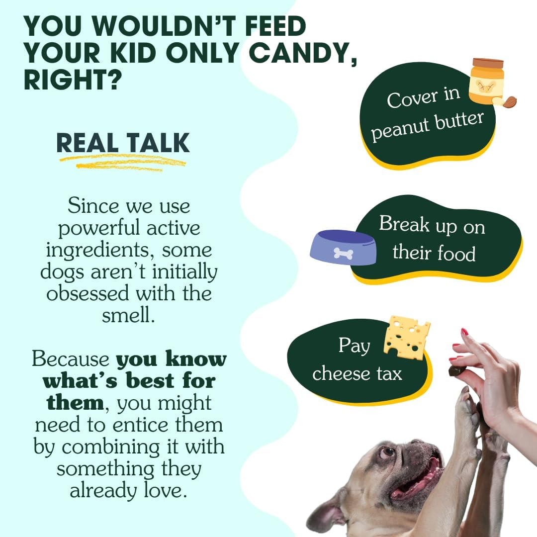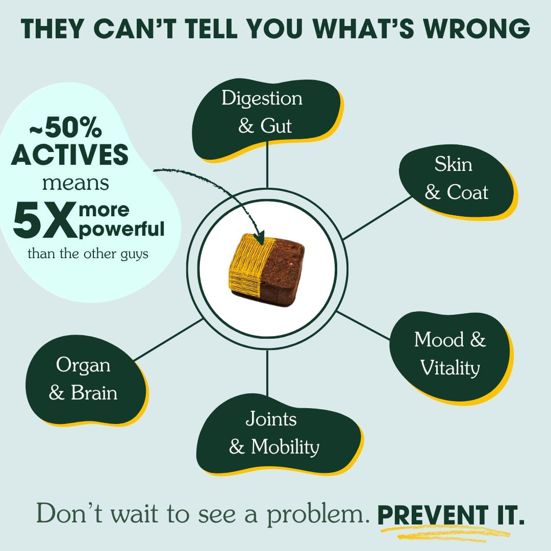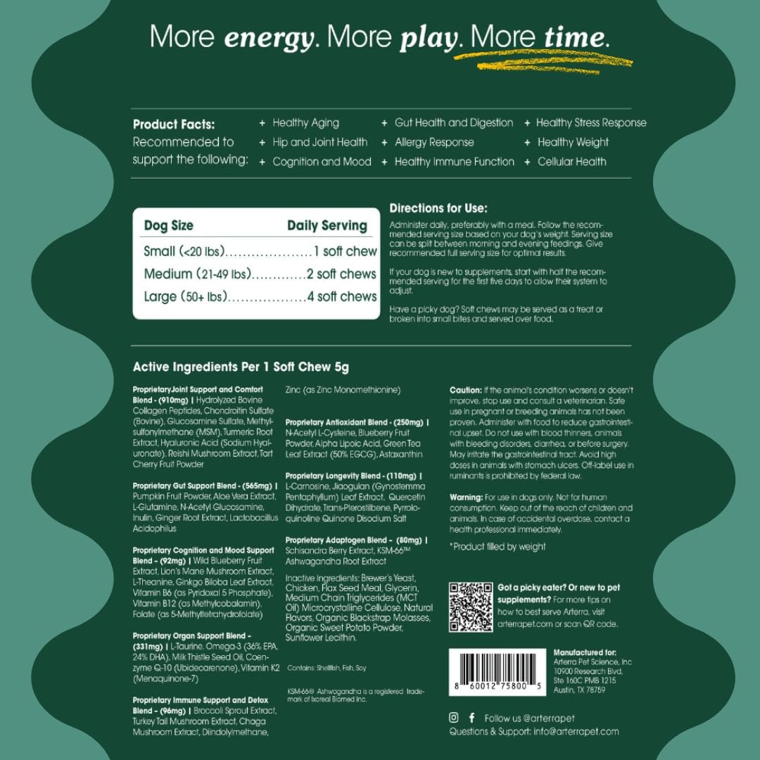 About this item Total-Body Health for Adult Dogs: Vet-formulated with 39 clinically studied ingredients to support your dog’s joints, brain, gut, skin, mood, energy, and immune system — all in one daily chew. Designed to proactively extend healthspan and keep your dog feeling their best. 50% Active Ingredients – No Fillers, No Fluff: Arterra delivers 5x the actives found in most dog supplements. Made in the USA with human-grade ingredients, this is real health science — not bacon-flavored candy. Backed by our Results Guarantee. Advanced Hip & Joint Mobility Blend: Supports comfort and flexibility with Glucosamine, Chondroitin, Collagen, MSM, and Bone Broth Protein. Helps protect cartilage, lubricate joints, and maintain daily mobility — especially important for active or aging dogs. Brain & Mood Support, Backed by Science: Powered by Omega-3s, Lion’s Mane, Magnesium Glycinate, and more to fuel focus, mood balance, and cognitive clarity. Keep your dog sharp, happy, and mentally engaged as they age. Gut Health & Digestive Balance: Loaded with prebiotics, amino acids, and functional botanicals that strengthen the gut lining, ease digestion, and support nutrient absorption. Because good health starts in the gut. › See more product details