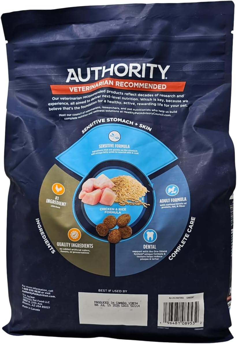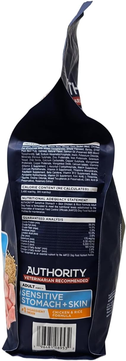 Authority dry dog food sensitive formula is formulated with ingredients that are gentle on your pups stomach and includes omega fatty acids to help nourish their skin and coat.