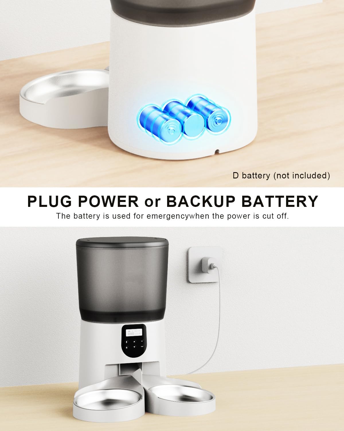About this item Feed Two Cats: The automatic cat feeder is perfect for two pets. It features a unique meal divider that ensures an even distribution of food, preventing any potential conflicts between the two cats during mealtime, perfect for long weekends and short business trips, providing you with peace of mind for 2 happy and well-fed pets Clog-free & High-Capacity Food Storage: With a generous 6L transparen food storage with a scheduled arrange 2 pets' feeding for 2-3 weeks at the same time. Plenty of storage space reduces the need for frequent refills, and transparent granary lets you observe the grain levels in real time, ensuring you know precisely when it's time for a refill Voice Record Meal Call: Record up to 10 seconds of your voice for mealtime calls. Let your cat and dog hear your voice when it’s mealtime to create a strong bond and set good eating habits. (Manual Feeding Function: Press the "Feed" button to give your pet extra rewards) Personalized recording of timed cat feeder makes your pet feel safer Power Backup & Outdoor Feeding: Whether powered by an adapter or 3 D-size batteries (not included), the automatic cat feeder ensures reliable feeding even during power outages. This automatic dog feeder can also be placed outdoors, catering to both indoor and outdoor pets. It guarantees consistent feedings for your pets, no matter where you are, making it the best choice for pet owners who like to enjoy the outdoors without worrying about their pets' feeding schedule Secure Sliding Lock Lid Storage: Storage container comes equipped with a convenient sliding lock lid, ensuring a tight seal to preserve the freshness and crunchiness of your pet's food and secure from any poaches. With the included desiccant, the pet feeder keeps food fresh and delicious for every meal Detachable Stainless Steel Bowl: The automatic cat food dispenser is equipped with a food-grade, stainless steel bowl that is odor-free and hypoallergenic, ensuring the health and safety of your pets. This removable, easy-to-clean bowl helps maintain a hygienic feeding environment, reducing the risks of allergies and promoting long-term well-being. Perfect for cats, dogs, or any pet needing a clean, safe cat food dispenser › See more product details