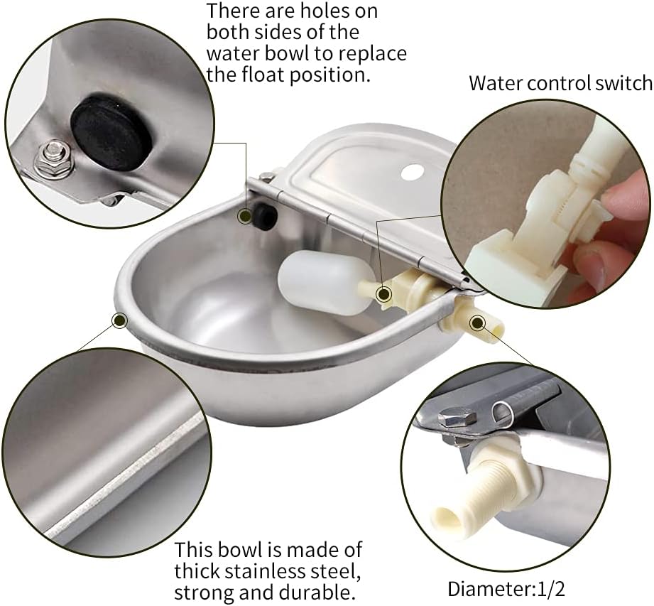 About this item High Quality Material: Automatic Cow Drinking Water Bowl Made of 304 stainless steel, durable, no rust, no deformation, clean and sanitary.The edge is polished smoothly, Effectively prevent metal drinking bowl cut snout. Automatic Water Injection: The float valve use of float water level floating principle control the inlet and outlet water switch, to achieve a constant water level effect, keeps enough water and always clean water. Easy To Install: 2 holes at the back are convenient to attach this waterer to the wall. (Note: Mounting screws not included and hose) Application: It suitable for horse, cow sheep, pig,dogs, chicken drinking water. If you have any questions about the product, feel free to contact us, we are here to help. › See more product details
