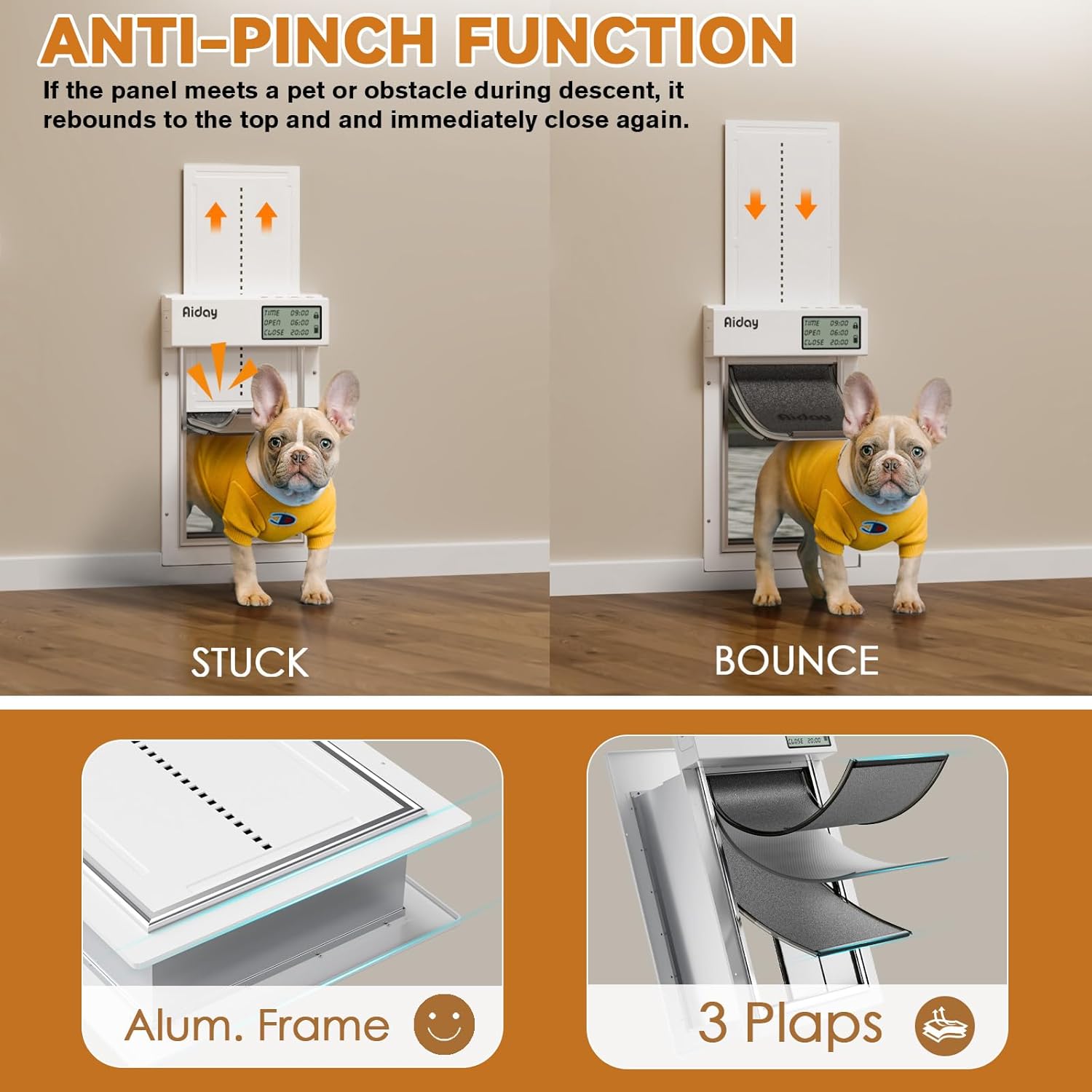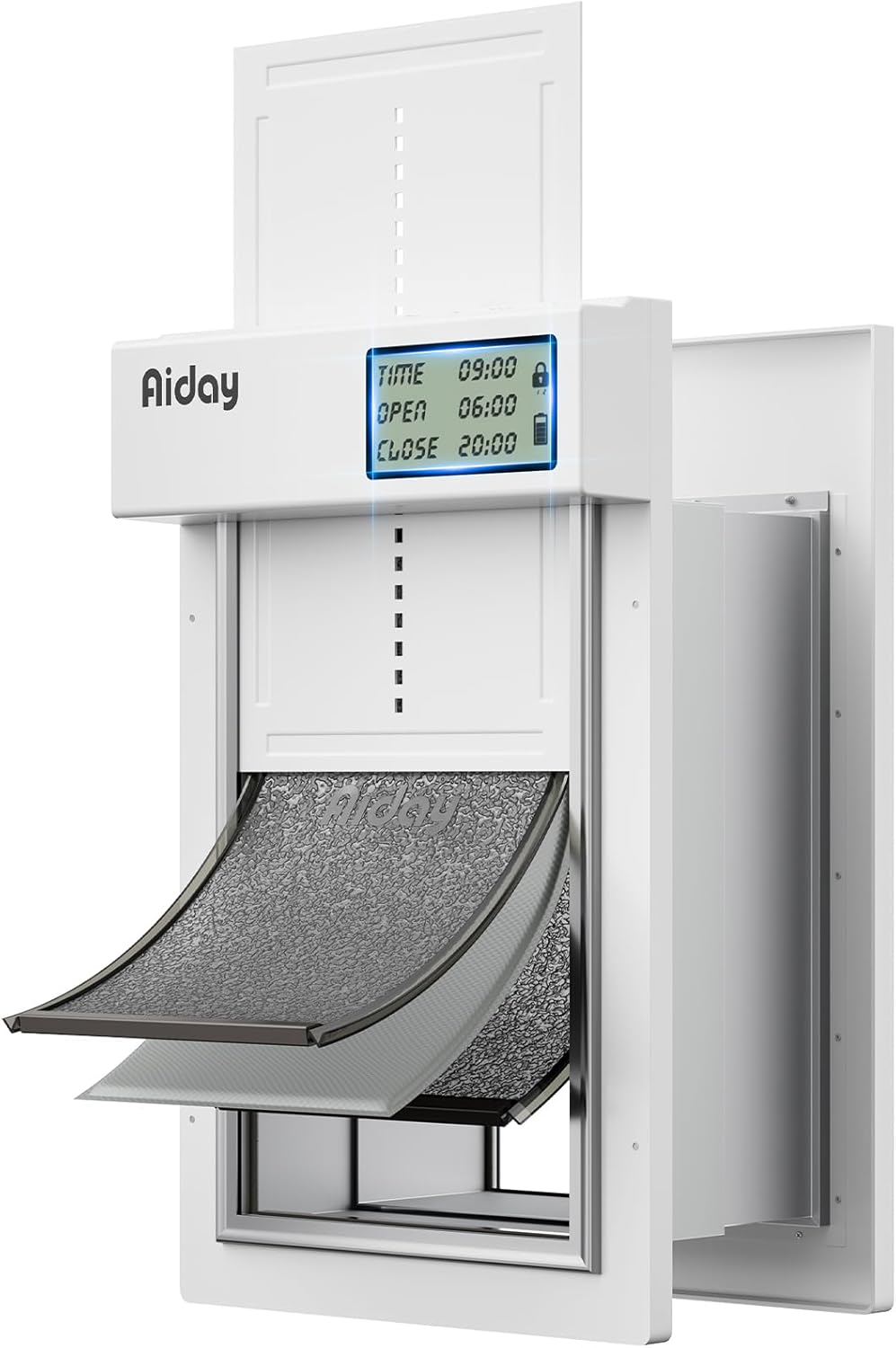 About this item Smart Dog Freedom: Let your dog come and go on their schedule – set pre-scheduled door openings for lazy mornings or weekend trips. Need instant control? The manual mode locks the door with a single tap during delivery days, storms, or those cozy moments when you want your furry friends to stay close. Perfect for Meduim Pets: Our aluminum dog door features an expandable tunnel for walls 4"-7" thick. Requires only an 9.2"x14.6" cutout. The 8.1"x12.3" flap comfortably accommodates large dog up to 40 lbs. Anti-Pinch Protection The safety-enhanced automatic dog door stops and reverses closing instantly if your pet passes through mid-cycle, preventing trapped paws or tails. Easy Control & Built to Last The oversized LCD shows settings instantly with intuitive controls. Crafted with high-quality aluminum alloy for lasting durability.The three-layer flap system with magnetic seals and steel panels blocks wind and rain while maintaining energy efficiency. Battery-Powered Operation Requires 4 AA batteries (not included). Provides reliable performance for up to 3 months. Features a battery level indicator and easy-access compartment — swap batteries in seconds without tools. › See more product details