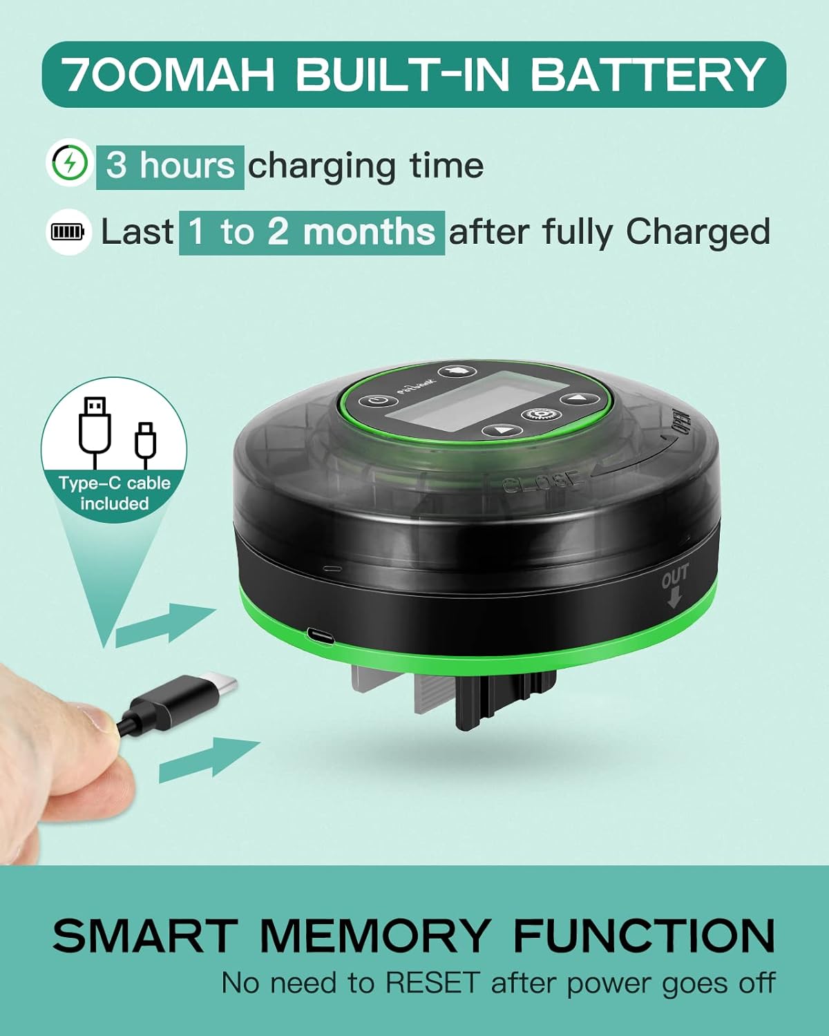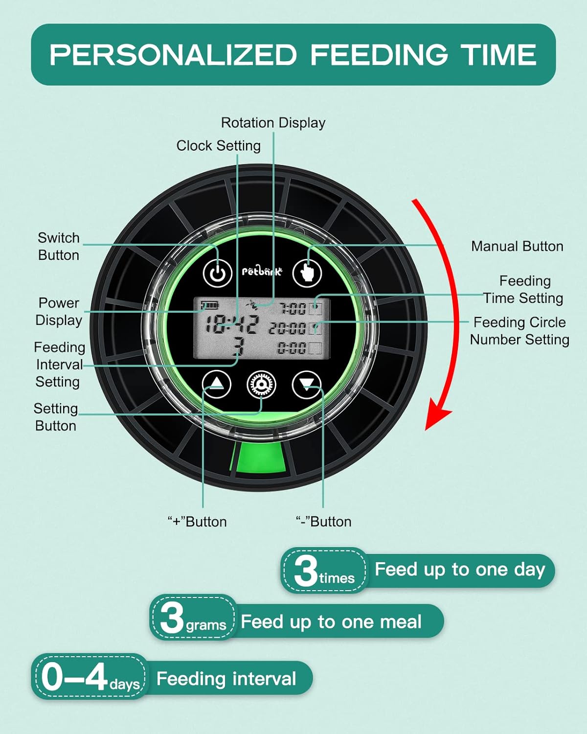 About this item Accurate Food Amount :Compared with ordinary fish feeders with only one compartment, Petbank updated automatic fish feeder contains 16 grids in total, which is able to provide 15 individual meals, convenient to store a variety of food. Each grid holds up to 2g, ensuring high food accuracy. Note: Please don't store fish food at the outlet compartment 2 Setup Methods :Petbank aquarium feeder provides two different installation ways to fit different types of aquariums. You can either mount it to the tank by adjustable clamp base, or stick it on the tank cover with suction cup. Both methods are easy to operate, so you can choose any way to meet your needs Moisture-resistant Design: Unlike other auto fish feeder with one opening that is always on, making food inside wet or jammed easily, Petbank auto food dispenser is fully sealed against moisture, whose opening will close automatically after each feeding. This thoughtful design effectively keeps fish food dry. Petbank accommodates most types of food, such as particle feed, pellets, powders and small strips. Note: It’s not for shrimps and flakes Customized Feeding Time :With the help of intelligent LCD display and timer function, Our automatic fish feeder can be programmed up to 3 feedings per day, with maximum 3 grids per feeding. You can also set it to feed at any time of the day and have it deliver every single or two or three or four day. If you want to experience the fun of feeding, you can also choose manual feeding USB Rechargeable: Petbank rechargeable timer feeder features 700mAh built-in battery, which can be fully charged in 3 hours and then last up to 1 to 2 month. (type-C charging cable included). No need to buy batteries repeatedly, which is energy and cost saving › See more product details