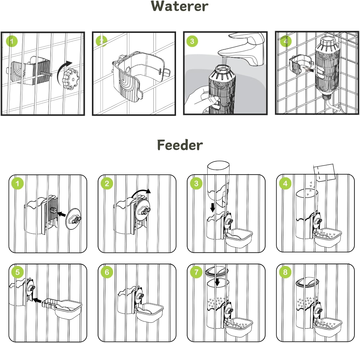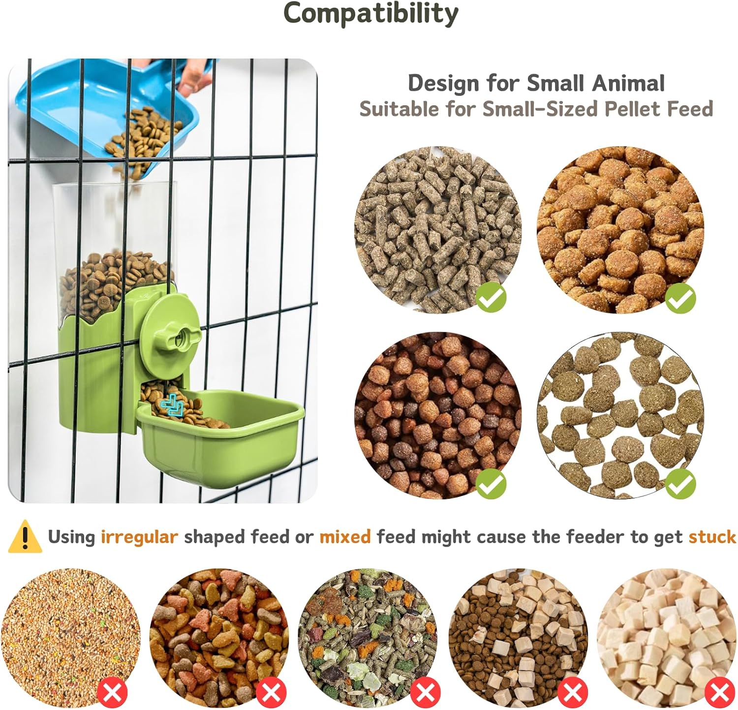 About this item Measure Before Purchase: Ensure horizontal bar spacing is greater than 1.1in/2.8cm and vertical bar spacing is over 0.8in/2cm for a proper fit. Best for Small Pellets: Recommended for use with small-sized pellets less than 1 cm/0.4in. Irregular shaped or mixed pellets may cause the feeder to jam. Ample Capacity: The water dispenser can hold up to 17 oz of water, while the feeder can accommodate up to 34 oz of food. Premium Quality Materials: Our product is crafted from durable PP, PET, and ABS materials, ensuring safety and longevity. It's non-toxic and BPA-free. Automatic Feeding and Watering: Designed for convenience and efficiency, this dispenser set ensures your pet's hydration and feeding needs are always met. › See more product details
