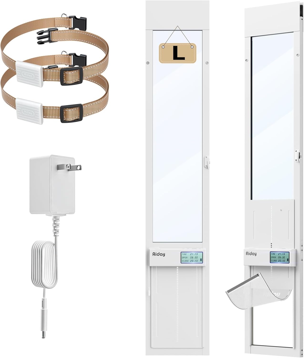 About this item Automatic Sliding Glass Dog Door: Aiday large electric doggy door comes with 2 exclusive sensor collars—only your pet triggers entry (no strays, cats, or raccoons). It auto-opens as your pup approaches (no pushing!) and locks tight 8 seconds later. One button adjusts the sensing range (20-28" or 35-43"). Patent pending. Custom Scheduling & Manual Control:Set access hours directly on the automatic sliding glass dog door—perfect for lazy mornings when you want to sleep in or short trips away. Collared pups come and go freely during your set times; after hours, the door ignores collars (so no midnight zoomies out the door!). Manual control lets you override anytime, just in case. Fits Large Pets (Up to 100 lbs):Aiday automatic sliding glass dog door has an adjustable frame that fits heights from 76" To 80-11/16" . The glass door opening measures 10" wide. Pro tip: For a perfect fit, measure from the top track to the inner bottom track of your aluminum sliding door frame before installation. Anti-Pinch Protection :Aiday large sliding glass dog door has a flap for smooth entry/exit, plus a built-in anti-pinch feature: if your pet lingers mid-passage, the door instantly stops and reverses to protect paws and tails. Plug-In Power with Easy Operation:Aiday automatic sliding glass dog door with sensor collar plugs directly into any outlet (extension cord included) for worry-free, continuous power. The extra-large display makes every setting instantly visible—no confusing menus, just straightforward operation you can trust every day. › See more product details