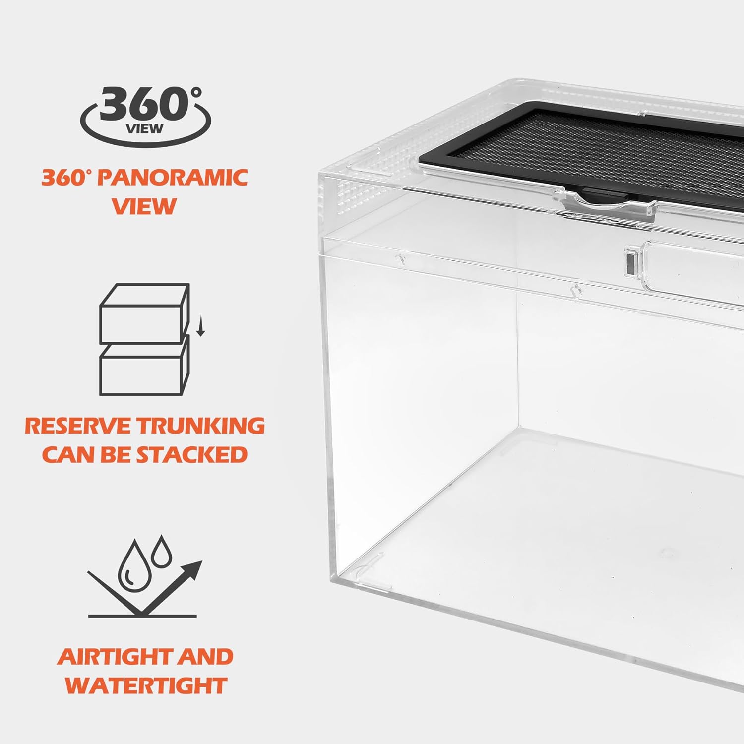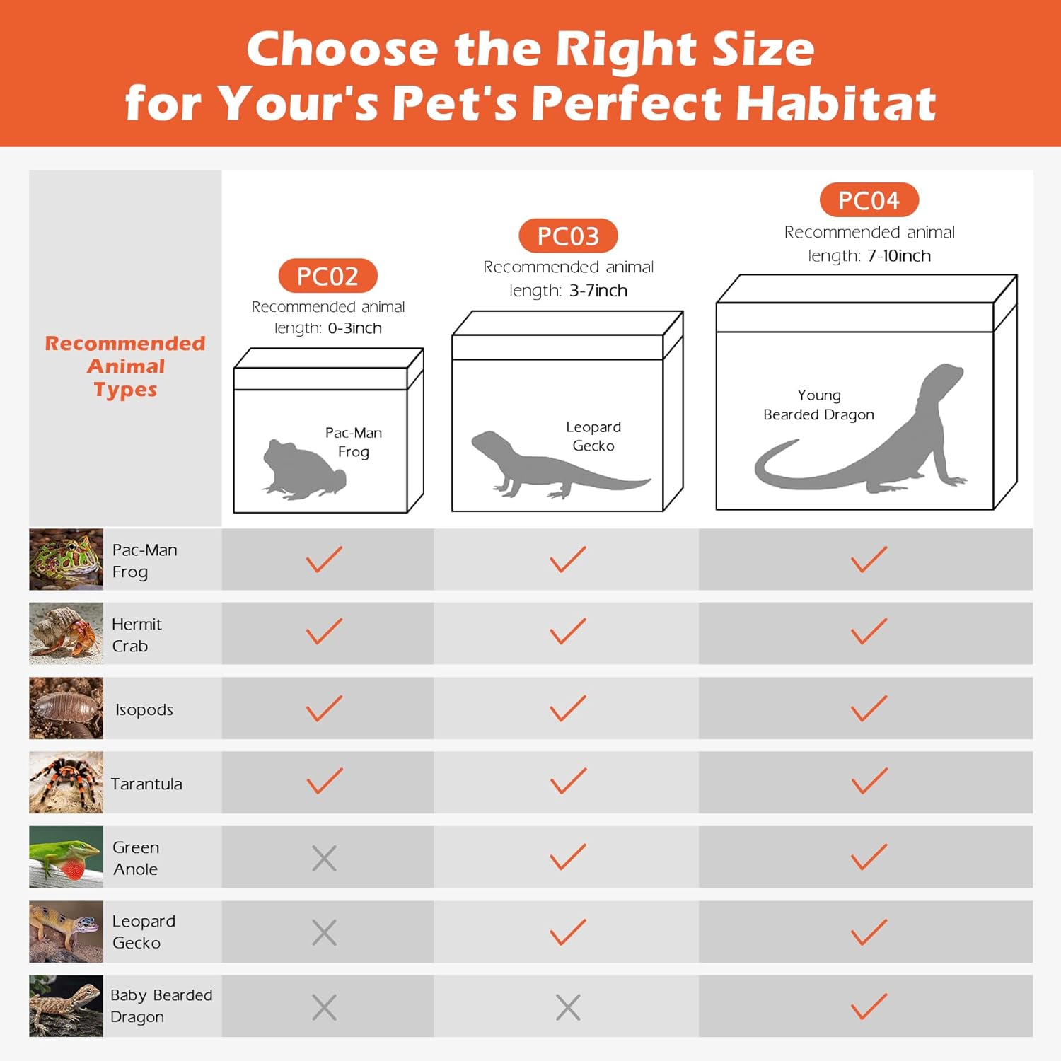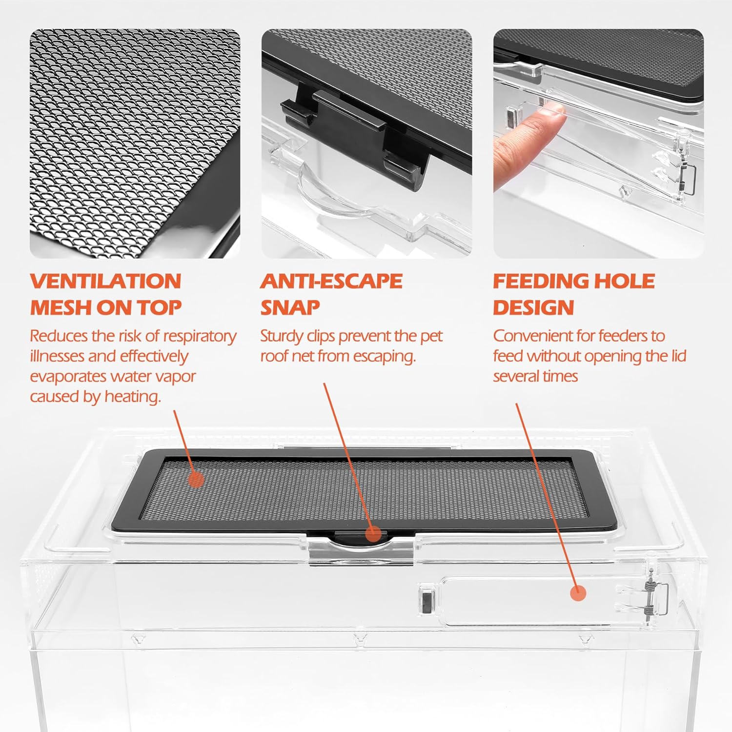 Sturdy and Durable: This compact mini terrarium is made from thick and durable tempered PC materials, ensuring safety. It offers a 360-degree view of the habitat, with a tough screen top for ventilation and UVB infrared penetration Designed for Easy Feeding: Our amphibian feeder features convenient feeding holes and escape-proof door locks, eliminating the need to open the lid multiple times for feeding. It's designed to make feeding easier and more convenient for caretakers