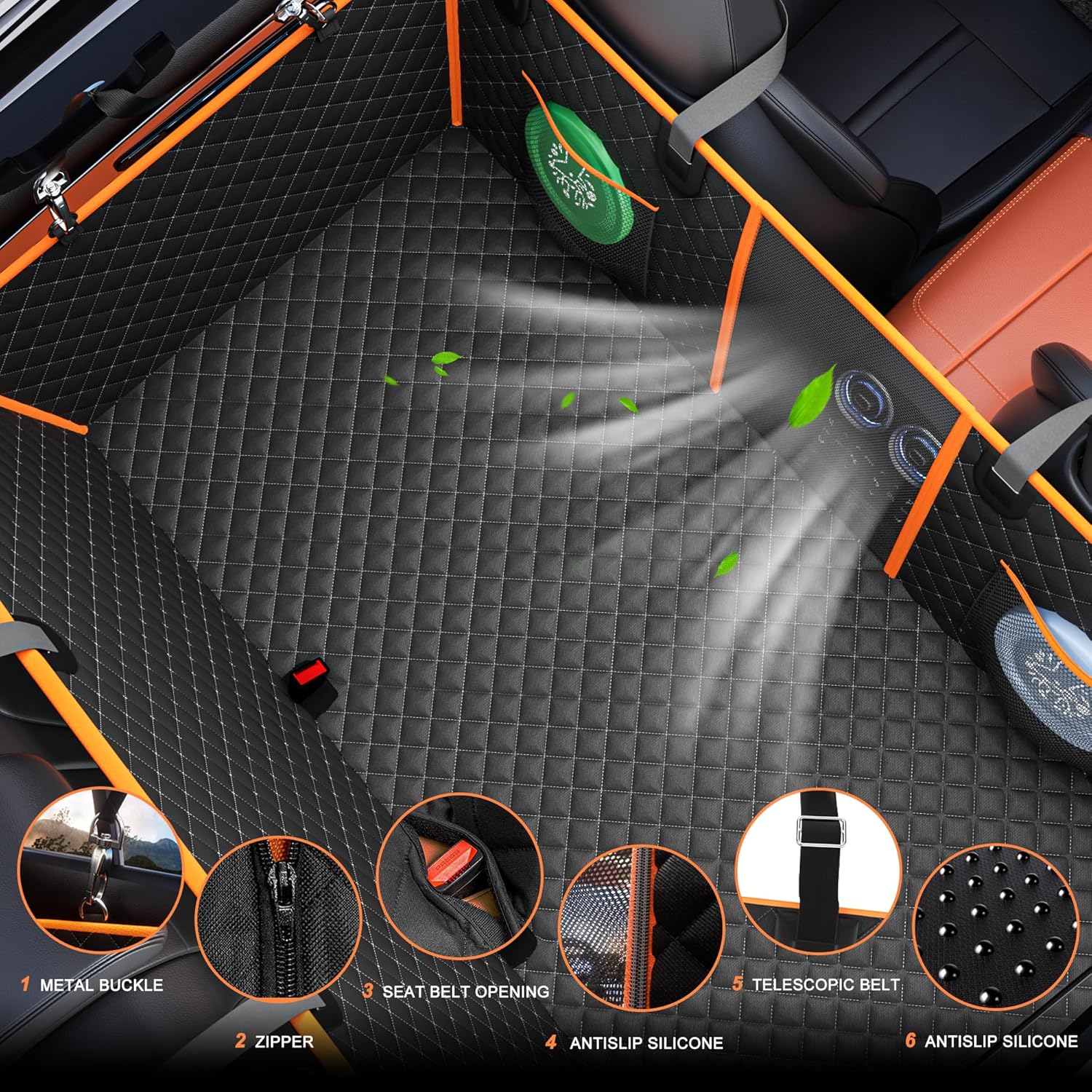 About this item 【Extended Space & Secure Ride】Transform your back seat into a spacious dog bed! Our back seat extender for dogs expands up to 52"x25", providing 40% more activity space. The hard bottom supports 420lbs, making it perfect for large dogs or multi-pet families. EVA non-slip backing keeps the cover stable, ensuring your pet’s safety during sudden stops. 【Waterproof & Scratch-Resistant】Back seat pet cover for dogs with its unique 6-layer design, including 600D Oxford fabric, PP cotton filler, load-bearing hardboard, 210D Oxford fabric, PVC waterproof coating, and EVA non-slip backing, this premium dog car seat cover for back seat provides complete protection against spills, mud, claws, and fur. It’s easy to clean: simply wipe with a damp cloth or machine wash. 【Breathable Mesh Window & Storage:】Dog hammock for car reduces your dog’s travel anxiety with a breathable mesh window that allows them to see you and enjoy fresh airflow. The mesh window features non-slip zippers on both sides, making it easy to interact with your pet during the ride. Two large storage pockets are perfect for holding toys, treats, and other essentials. 【Premium Heavy-Duty dog car seat cover】 Engineered for maximum durability, our upgraded dog seat cover for back seat seamlessly fits sedans, SUVs, and trucks. Plus, it comes with a convenient carrying bag for hassle-free storage and portability.Ideal for cross-country adventures, outdoor camping, or daily commutes - your ultimate solution for pet-friendly vehicle protection!" 【Upgraded Comfort & Easy Installation】Our hard bottom car seat cover for dogs features padded sponge, providing ultimate comfort for your furry friend. Simply unfold the cover and spread it across the back seats. Secure it with the adjustable straps by attaching them to the car seat headrest poles and armrests. All buckles are designed for quick and easy fastening. › See more product details