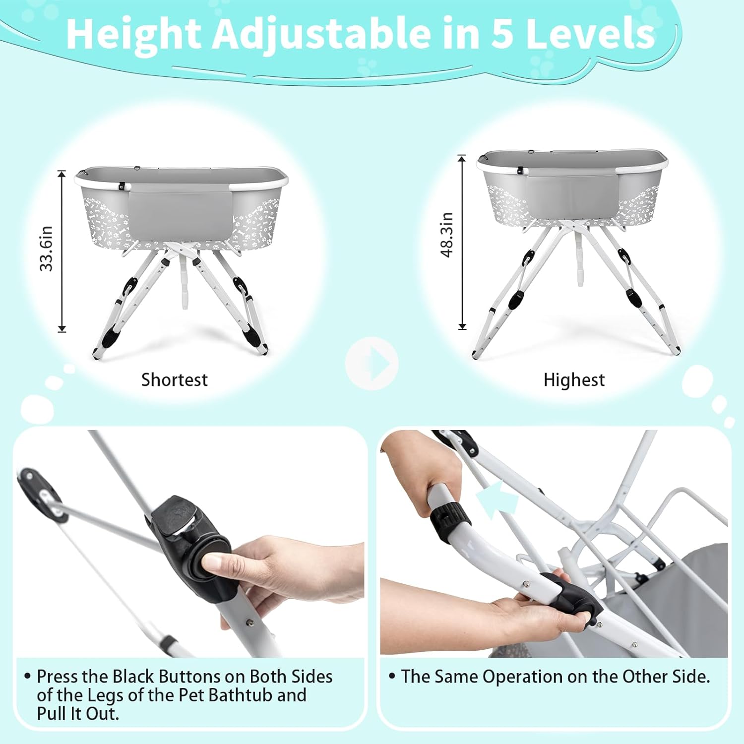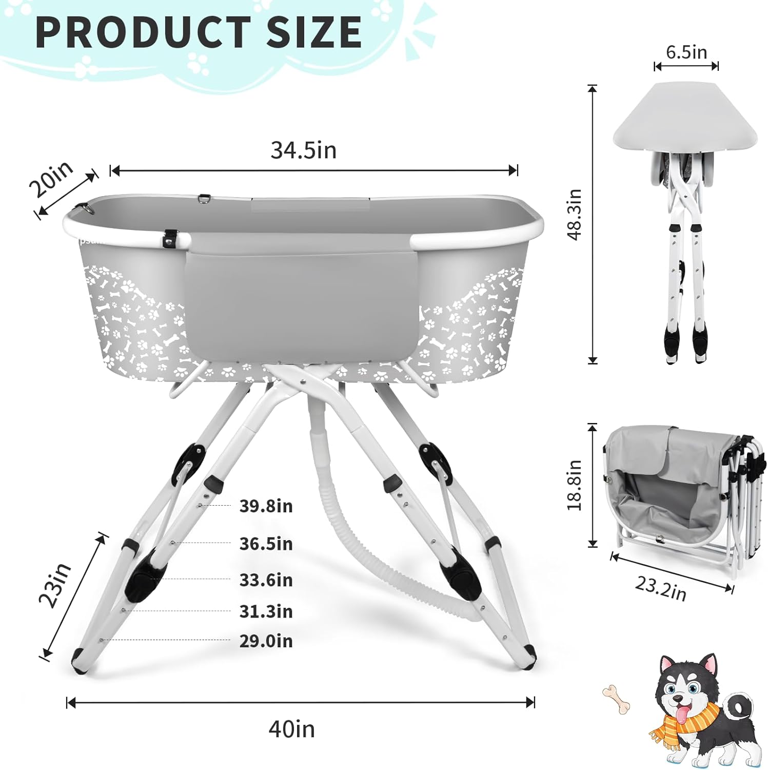 Spacious Dog Bathtub Design: This professional-grade dog bathtub features an expanded 34.5"L x 20"W x 48.3"H interior (5 height adjustments) specifically engineered for your dog's body structure. The roomy dog washing tub allows natural stretching movements, significantly improving bathing comfort for medium to large breeds. 5-Level Adjustable Dog Bathtub: Our ergonomic dog bathtub offers 5 customizable height settings (29"-39.8") to prevent back strain - the elevated dog bathing station reduces lumbar pressure by 60% when washing pets up to 140 lbs. Perfect for indoor/outdoor use. Premium Safety Upgrades for Dog Bathtub: Adjustable safety tether (prevents jumping), quick-drain hose attachment, plus side storage pockets for shampoos & tools - making this the safest dog washing tub for anxious pets. Space-Saving Foldable Dog Bathtub: The innovative dog bathtub folds to just 7" wide in seconds with one-hand operation. This portable dog bathing station fits in car trunks for travel and stores vertically in tight spaces - ideal for mobile groomers. Environmentally friendly and easy to clean: A portable dog bath table made of non-toxic reinforced PVC composite material. After use, simply open the water outlet, drain the water, and dry it with a tissue or towel. › See more product details