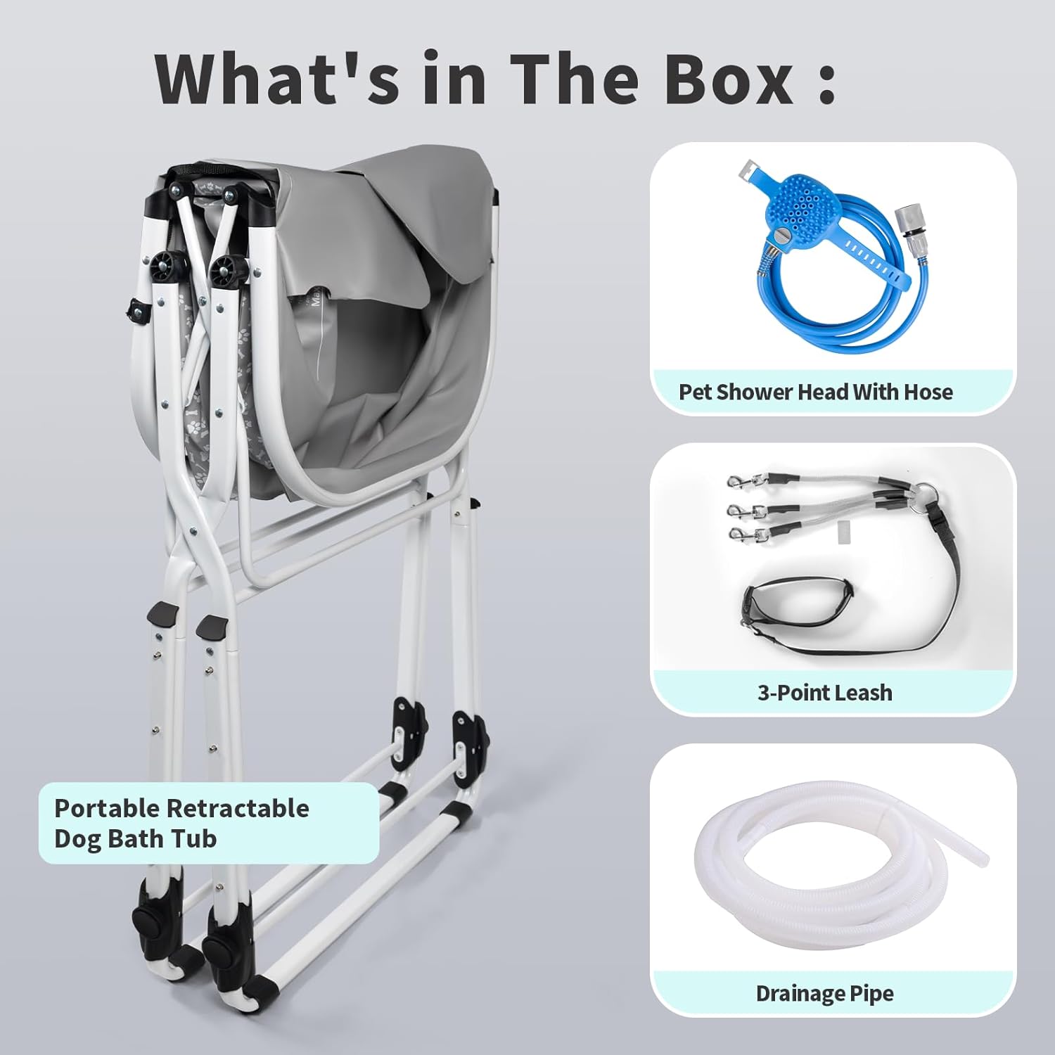 - Included Components: dog bathtub、pet shower、3-point leash、drain pipe