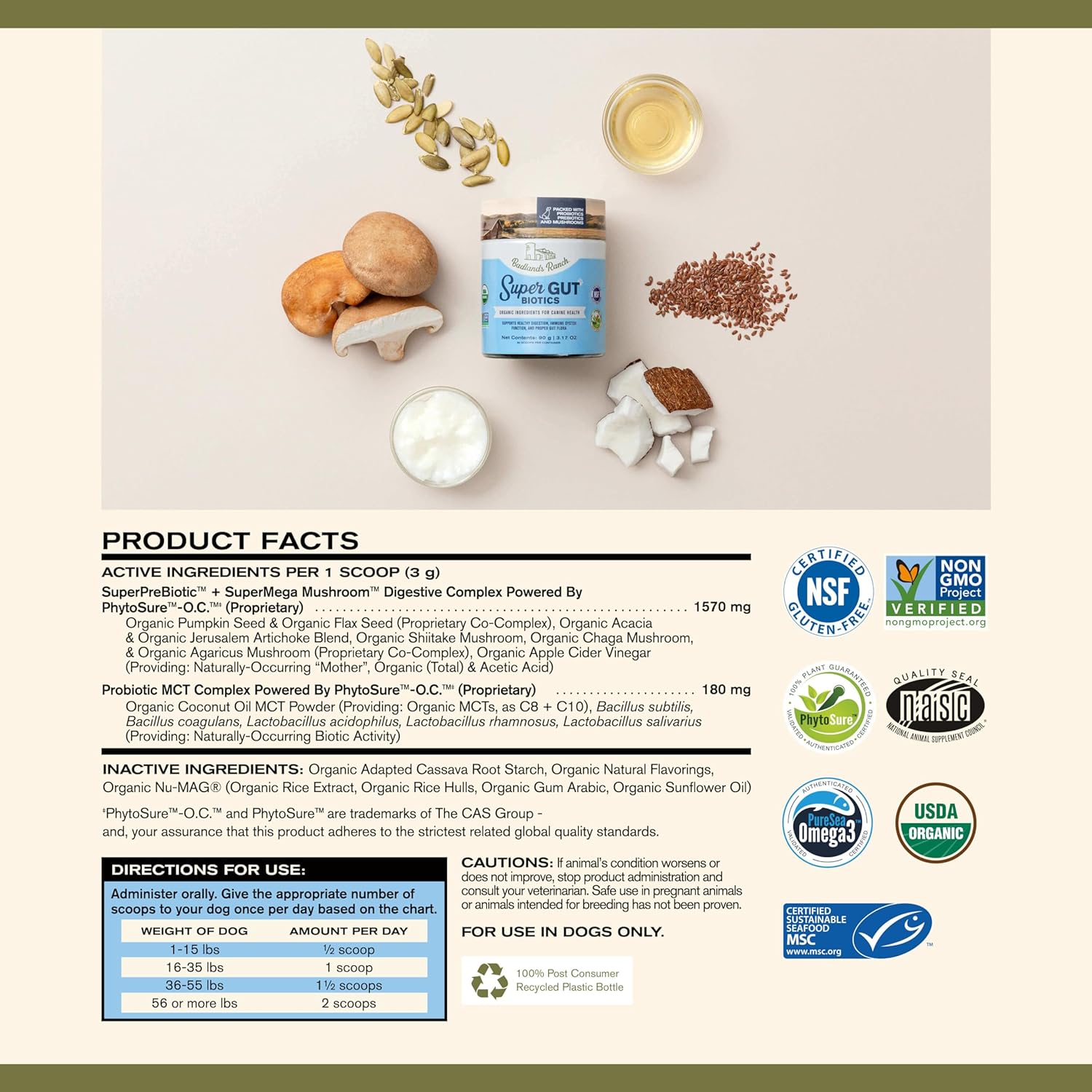 About this item Organic Mushroom Blend: This proprietary blend includes organic shiitake, chaga, and agaricus mushrooms rich in Beta glucans, soluble fibers that bolster your dog's immune system and gut health.* Flax Seed and Pumpkin Seed Powder: A nutritious combination of flax and pumpkin seeds, packed with essential vitamins, minerals, and fiber, supporting your dog's digestive system for regular, effortless bathroom breaks.* Probiotic Blend: A carefully selected mix of 5 potent probiotic strains designed to maintain healthy gut flora.* Organic Jerusalem Artichoke: A powerful source of prebiotics that supports the growth of beneficial gut bacteria, ensuring your dog's overall well-being by fostering a healthy digestive environment.* 3rd Party Certified: All supplements are 3rd party tested and certified to ensure premium quality for your pet. › See more product details