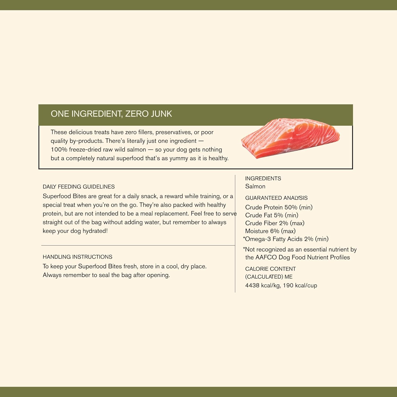 About this item Superfood Bites are crafted with real, wild-caught salmon for the savory taste your dog deserves. The single-ingredient formula can be a good choice for dogs with sensitive stomachs. This protein-rich treat is a high-value training reward for dogs of all ages and sizes. Each bite is gently freeze-dried to help naturally preserve its fresh taste and flavor. Contains no additives or preservatives for a simple, tasty treat. Reward your dog while also helping them stay fit, active, healthy and happy. * › See more product details