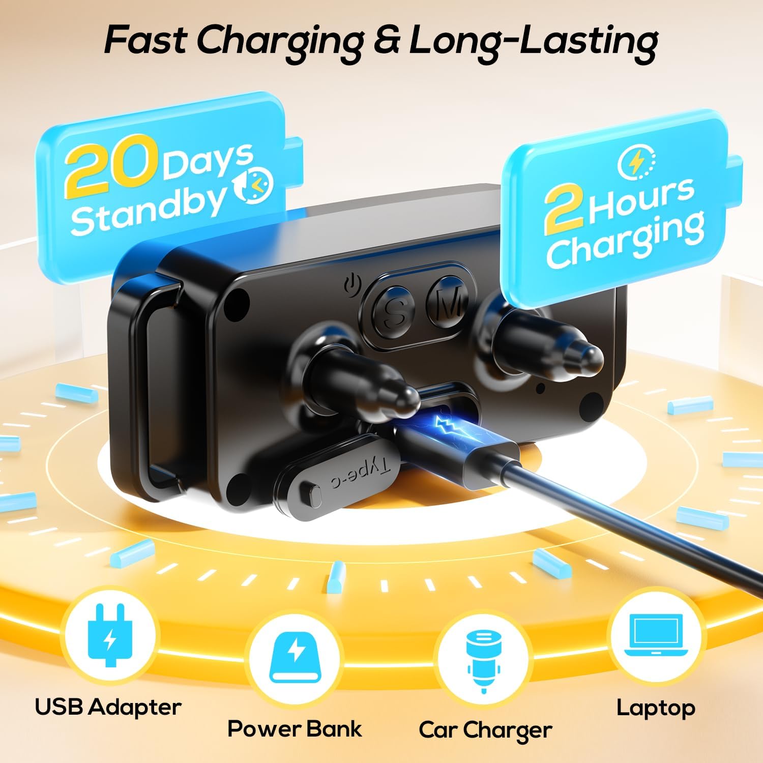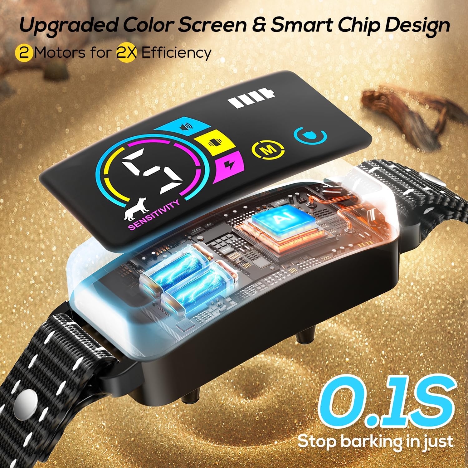 About this item Suitable for Most Dogs: This lightweight bark collar is adjustable to fit dogs of different sizes, and you can easily adjust them as your dog grows. The double reflective stitching on the collar increases visibility and provides extra safety for your dog on night walks. Multiple Training Modes: The barking collar offers 4 training modes and 5 adjustable sensitivity levels, suitable for both gentle barkers and more stubborn breeds, ensuring effective control. Fast Charging & 20-Day Standby: Fast charging quickly powers up the vibration collar while enjoying up to 20+ days of standby time. The intuitive LED color display provides easy navigation and rich information at a glance. The stylish appearance design makes your pet stand out. Additional Protect Mode: Designed with your dog's well-being in mind, our dog training collar automatically pauses for 30 seconds after 7 consecutive triggers to relieve over-stimulation. This thoughtful feature combines humanistic care with effective training to ensure a balanced, positive learning experience without unnecessary stress or discomfort. IP67 Waterproof: The waterproof performance allows your dog to wear it in all weather conditions, whether walking your dog in the rain or taking them for a swim, it also makes cleaning the collar a breeze, even after contact with mud outdoors. › See more product details