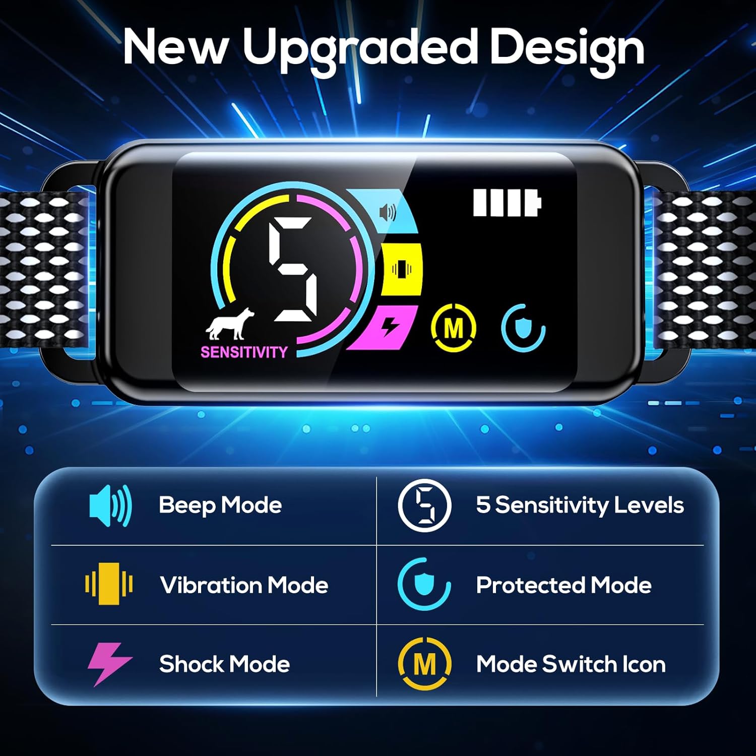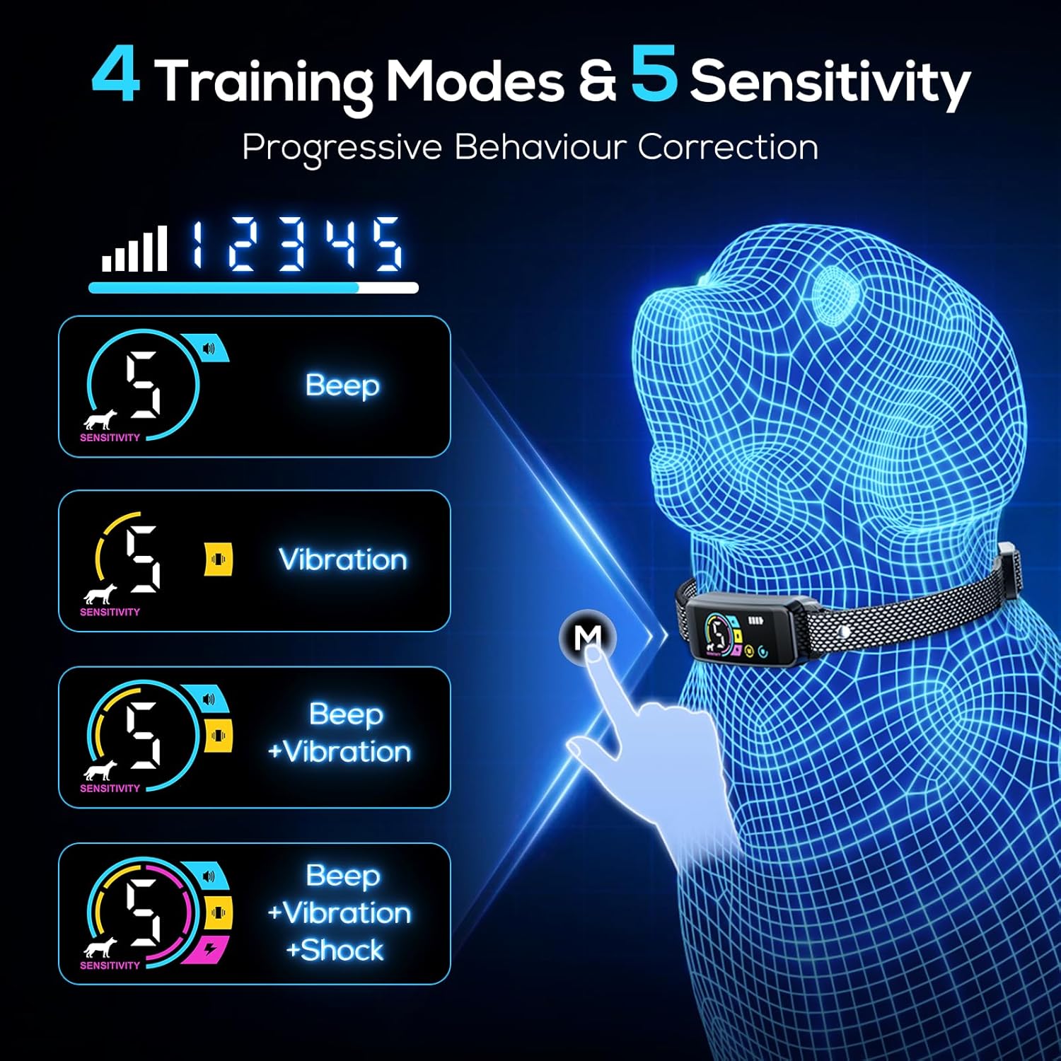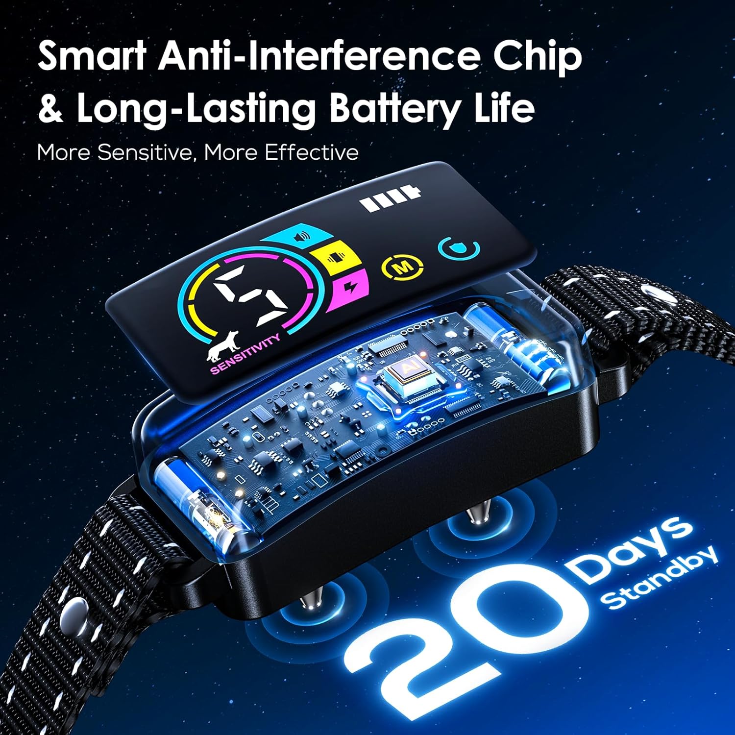 About this item 【Perfect Fit for All Dogs】Designed for small, medium and large dogs, our lightweight bark collar feature an adjustable strap that grows with your dog. Soft reflective nylon ensures a comfortable fit, and double reflective stitching for increased visibility, ensuring safer nighttime walks. 【4 Humane Training Modes】You can choose beep, vibration or a combination of both, and for more stubborn dogs, there is a shock mode. Designed for gradual learning, the system starts with a gentle reminder and escalates only when needed, without causing stress or injury. 5 levels of adjustable sensitivity for a variety of environments. 【Smart AI Bark Detection& Waterproof】Say goodbye to false triggers! Our advanced AI chip detects only real barking, ignoring ambient noise or other pets. Additionally, this shock collar for dogs is IP67 waterproof and can withstand rain, snow and mud splashes. 【20 Days Battery Life】Spend less time charging and more time training! The fast-charging feature quickly powers up the anti barking device for dogs, and the 20-day standby time ensures it's always ready to go. The bright LED display shows battery level and settings at a glance, and the sleek design adds style to your dog. 【Additional Protect Mode】Our innovative protection mode automatically pauses the dog training collar for 30 seconds after 7 consecutive triggers to prevent over-stimulation. This user-friendly feature ensures stress-free training while promoting positive behavior. › See more product details