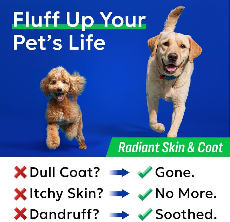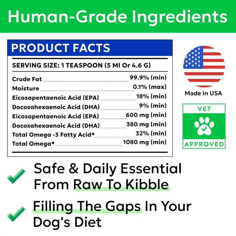 Help your buddy tackle dry itchy skin and get healthy shiny coat with Omega-Rich fish oil for Dogs. Packed with essential Omega 3 6 9 fatty acids, source from wild Alaskan salmon, these natural oil is all-in-one skin and coat supplement, formulated for daily use. Health benefits: - Support Healthy Skin & Coat - Relief Allergies - Itch Relief - Boost Immune - Hip & Joint Health Support - Brain and Heart Functions Support Dog fish oil is suitable for all breeds, sizes and ages, from puppies to older dogs. Recommended serving: Serve daily amount based on pet's weight: up to 15lbs - 1/2 pump; 15-25lbs - 1 pump; 26-50lbs - 2 pumps; 51-75lbs - 3 pumps; over 75lbs - 4 pumps.