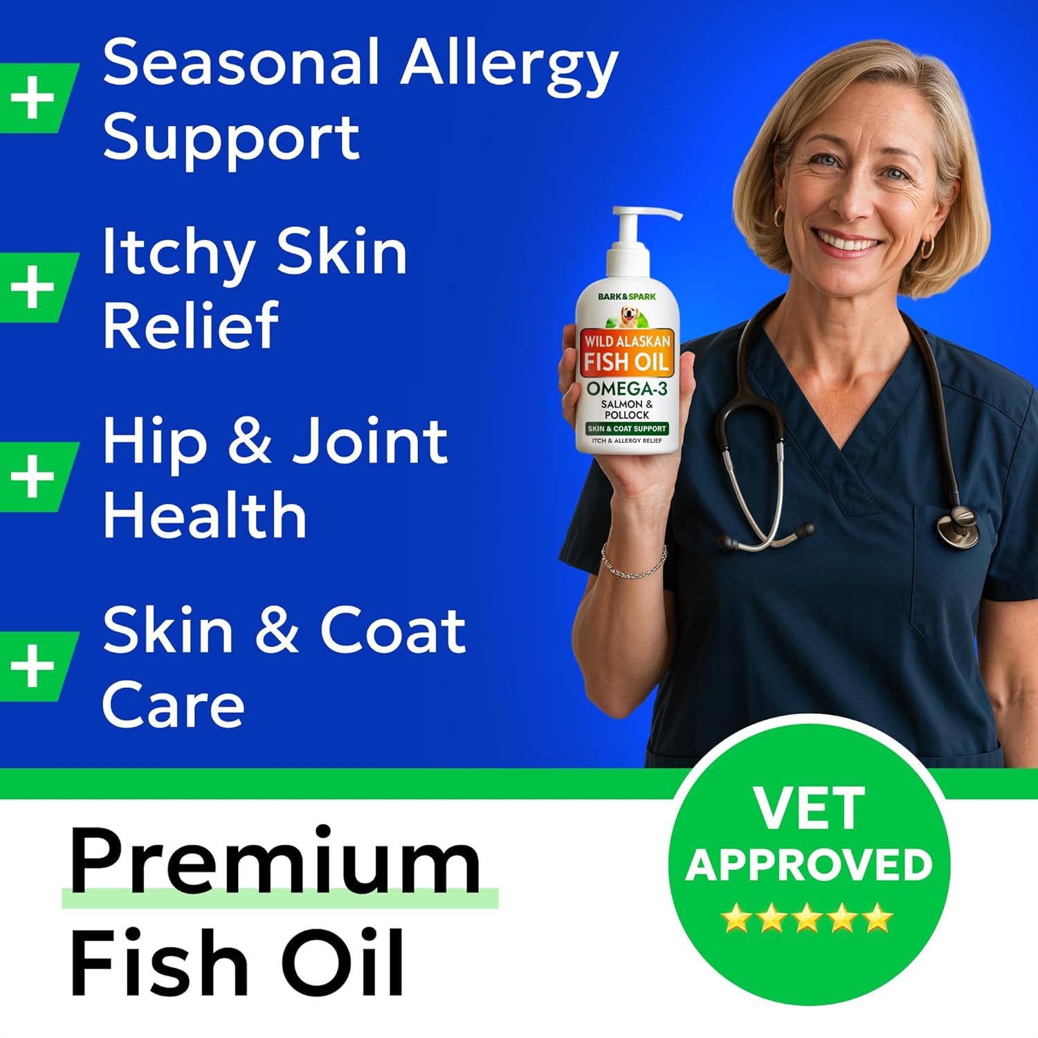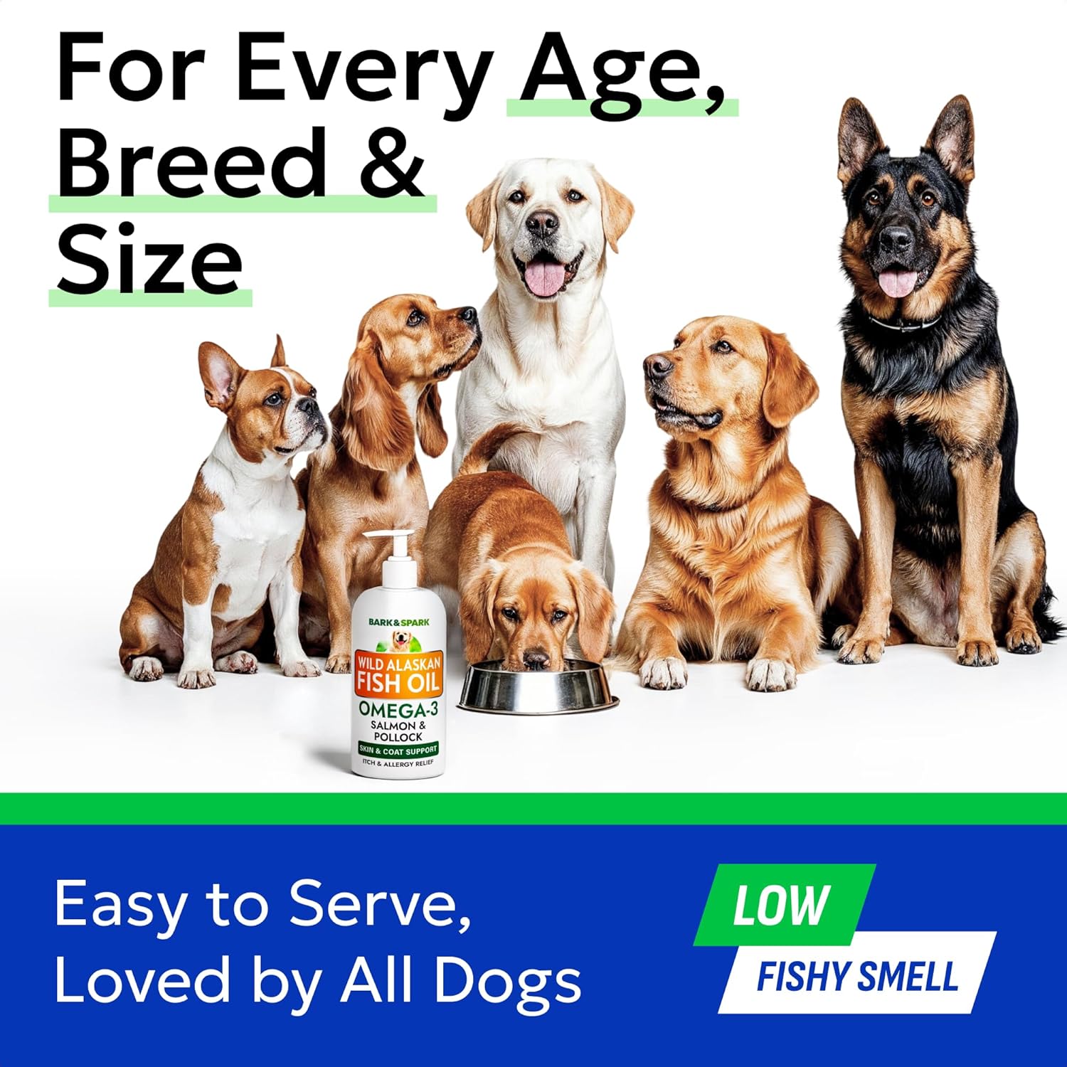 About this item Health & Shine: Boost your pet's health with our 8 oz fish oil for dogs & fish oil for cats. It provides essential vitamins, reducing shedding, itching, and supporting overall joint & skin health. Guaranteed Satisfaction: We stand behind our omega-3 fish oil for dogs with a 90-day satisfaction guarantee. Hassle-free refunds make it easy to try our dog salmon oil & pollock oil blend. Pure & Vitamin Enriched: Made with pure pollock & Alaskan salmon oil for dogs, our omega 3 for cats & dogs includes DHA, EPA, and fatty acids for healthy triglyceride levels. Superior Quality: Our dog fish oil supplements provide the highest quality omega 3 for dogs. They support healthy hip, joints, & a shiny coat of hair. Allergy & Itch Relief: Experience the benefits of pollock & salmon oil for cats & dogs. Our fish oil for dogs' skin and coat provides anti-itch relief, soothes dry, itchy skin, and helps with allergies. Perfect for Every Breed: Our salmon & pollock oil for dogs' skin and coat is perfect for all breeds, large and small. This omega oil for dogs supports healthy skin and a shiny coat. Easy to Mix: Unlike pills, tablets, and soft liquid gels, our dog fish oil is a liquid dog omega 3 supplement that's easy to mix with any food thanks to a handy pump. Consistent Use Matters: For the best results, use our potent pollock & wild Alaskan salmon oil for dogs consistently. The Omega three fatty acid works best with regular use. › See more product details