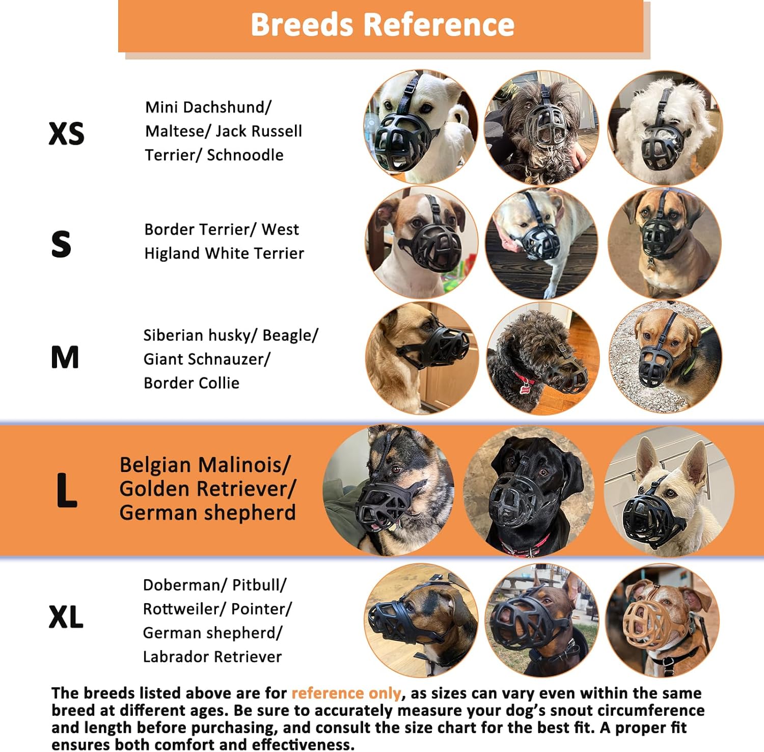 About this item The Only Muzzle You Need: Say goodbye to your old muzzle. The BARKLESS practical muzzle has features you need to prevent your dog from nipping, destroying, fighting and digging and eating everything while the basket-style design gives all-around mouth protection allowing your pet unrestricted drinking and panting. This muzzle for dogs make it the ideal choice for reactive dogs’ daily walks, occasional use, dog park socialization, grooming, vet visits, training, traveling, and walking Safe & Humane: Friendly dog muzzles are more pliable and softer, making them comfortable for the dog. Humane muzzle for dogs allow your dog to pant, drink and treat train while being worn with the uniquely designed bar spacing which forms the canine muzzle Easy to Use: Comfort-fit design for most sizes of breeds with adjustable head and neck straps allow you to quickly adjust the size to fit your dog, making it ideal for the puppy, small, medium, and large dogs. The twist on each side of the strap is part of a unique design, ensuring a better fit for your dog’s head shape. This is a thoughtful feature, not a defect, aimed at providing a more comfortable and secure fit Prevent Muzzle Slippage: An incorrect size, improper fit, or lack of muzzle training can cause the dog to remove the cage muzzle. Adjust the straps to ensure a snug fit—secure enough to keep the basket muzzle for dogs in place without causing discomfort. Check the head strap to prevent slippage. Refer to the included instructions to help your dog adjust to the dog muzzles to prevent biting Desensitizing Your Dog to a Muzzle: Many dogs may resist wearing cage muzzles for dogs initially, especially if they've never worn one before. To help them adjust, use gradual desensitization training—start with short periods and reward calm behavior. Over time, your dog will accept it as part of their routine Perfect Fit for Large Dogs: This option Size L large dog muzzle is ideal for large breeds like Golden Retrievers, German Shepherds. The breeds listed above are for REFERENCE only. Be sure to measure your dog’s snout circumference and length accurately before purchasing, and refer to the size chart. A proper fit ensures comfort and effectiveness › See more product details