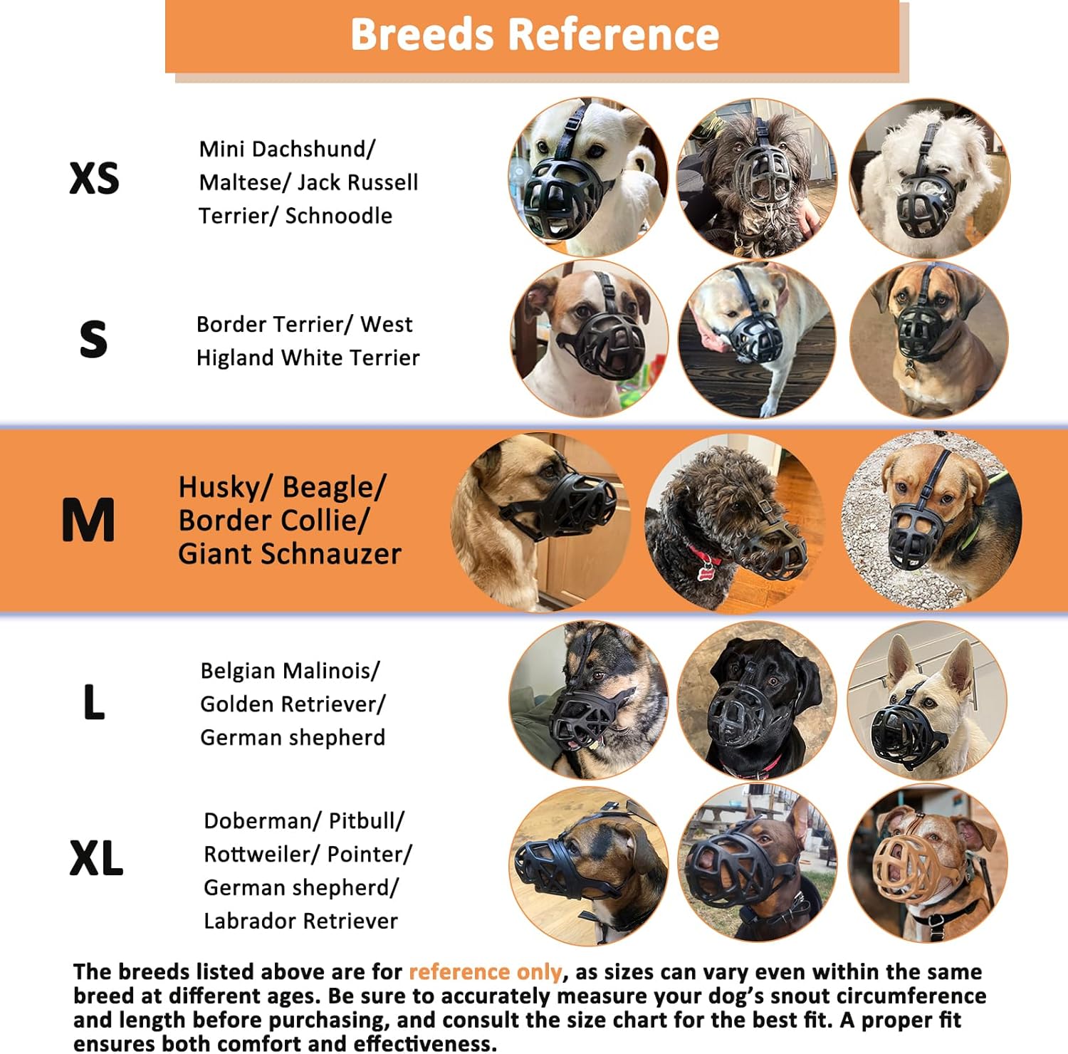 About this item The Only Muzzle You Need: Say goodbye to your old muzzle. The BARKLESS practical muzzle has features you need to prevent your dog from nipping, destroying, fighting and digging and eating everything while the basket-style design gives all-around mouth protection allowing your pet unrestricted drinking and panting. This muzzle for dogs make it the ideal choice for reactive dogs’ daily walks, occasional use, dog park socialization, grooming, vet visits, training, traveling, and walking Safe & Humane: Friendly dog muzzles are more pliable and softer, making them comfortable for the dog. Humane muzzle for dogs allow your dog to pant, drink and treat train while being worn with the uniquely designed bar spacing which forms the canine muzzle Easy to Use: Comfort-fit design for most sizes of breeds with adjustable head and neck straps allow you to quickly adjust the size to fit your dog, making it ideal for the puppy, small, medium, and large dogs. The twist on each side of the strap is part of a unique design, ensuring a better fit for your dog’s head shape. This is a thoughtful feature, not a defect, aimed at providing a more comfortable and secure fit Prevent Muzzle Slippage: An incorrect size, improper fit, or lack of muzzle training can cause the dog to remove the cage muzzle. Adjust the straps to ensure a snug fit—secure enough to keep the basket muzzle for dogs in place without causing discomfort. Check the head strap to prevent slippage. Refer to the included instructions to help your dog adjust to the dog muzzles to prevent biting Desensitizing Your Dog to a Muzzle: Many dogs may resist wearing cage muzzles for dogs initially, especially if they've never worn one before. To help them adjust, use gradual desensitization training—start with short periods and reward calm behavior. Over time, your dog will accept it as part of their routine Perfect Fit for Medium Sized Dog: This option Size M basket muzzle is ideal for medium breeds like Husky and Beagle. The breeds listed above are for REFERENCE only. Be sure to measure your dog’s snout circumference and length accurately before purchasing, and refer to the size chart. A proper fit ensures comfort and effectiveness › See more product details