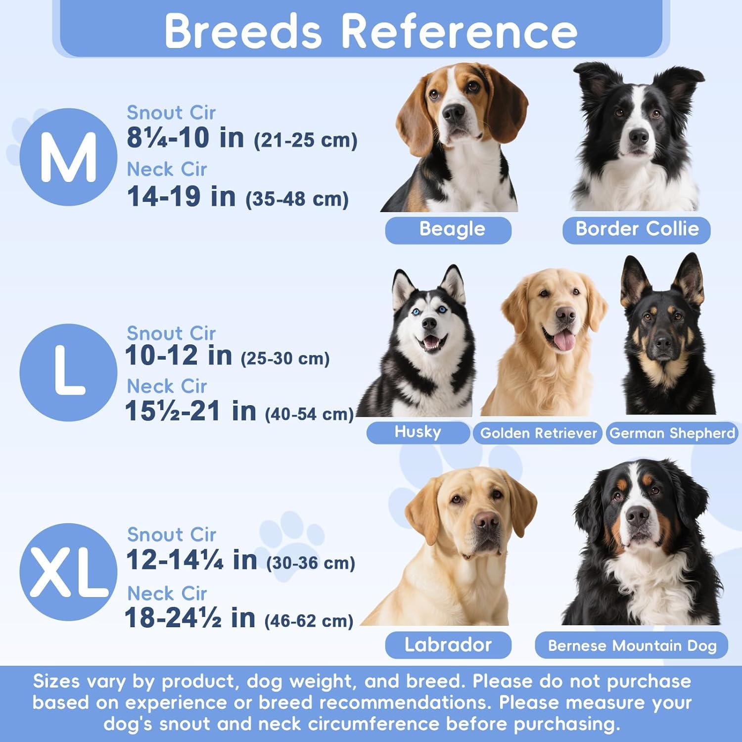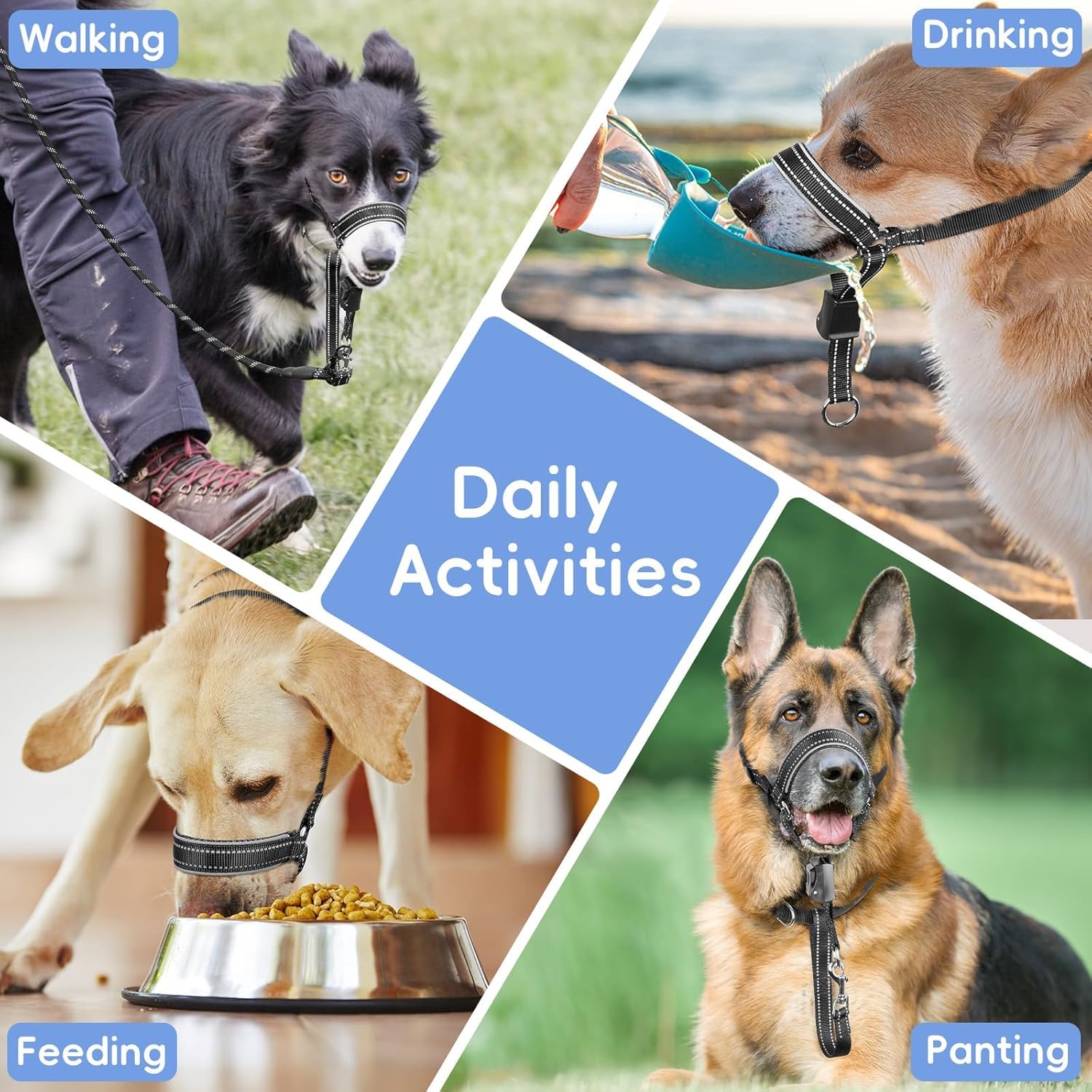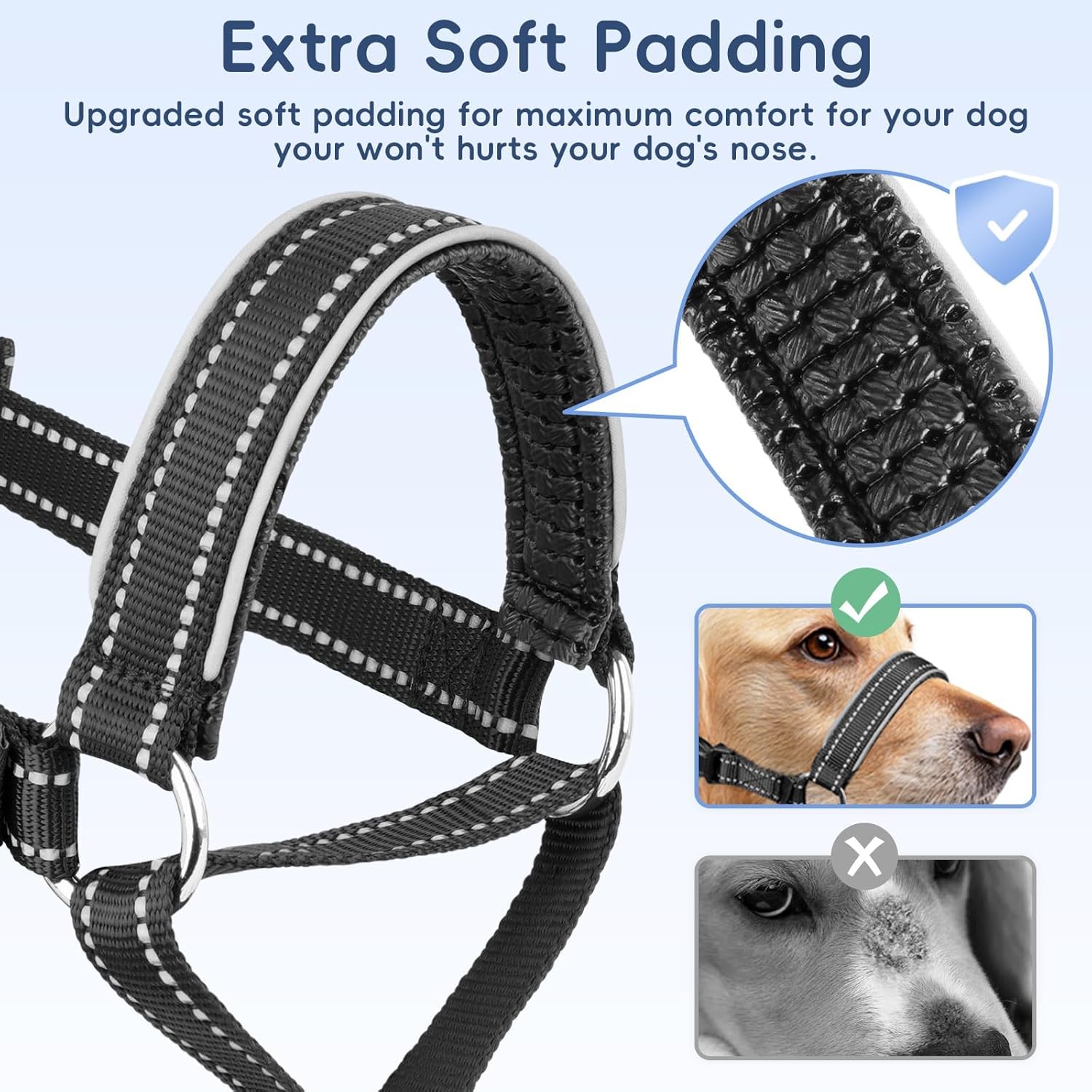 About this item With Soft Nose Pad: The nylon nose pad of this head collar for dogs has been upgraded with extra padding to prevent dog irritation. The large area of padding on the nose pad ensures your dog is comfortable wearing it. This dog head collar is ideal for gentle breeds, taking into account both comfort and safety Designed for Dogs Who Like to Pull: This large dog anti-pull head collar wraps around your dog's nose and gently turns his head toward you when he pulls, allowing him to refocus his attention on you and away from other distractions. Perfect for training and everyday walks. Experience stress-free walks with your dog Measure before purchase: Please measure according to the measurement guide before purchase, and pick the size according to the size chart. The size M over the nose dog leash no pull is suitable for dogs with a snout circumference of 8¼-10" and a neck circumference of 14-19", such as Border collie, Beagle. But it is not suitable for short-nosed dogs such as bulldog Reflective Safety for Low-light Walks: The dog head halter has reflective strips on the outer edge of the nose pad and reflective threads on the straps. The stylish daytime appearance can seamlessly transition into a high-visibility accessory after dark, ensuring drivers and pedestrians spot your dog in low-light conditions. Improve your dog's visibility and safety during nighttime adventures. Suitable for hiking or outdoor activities Adjustable Head Collar with Secure Fit: The head collar for dogs, no pull dog nose leash has an adjustable snout clip and neck strap, ensuring a secure fit, especially suitable for walking and training. The lightweight and sturdy design nose lead for dogs that pull reduce the burden on your pet while maintaining control over it during walks, vet visits, or meeting strangers. Does not restrict daily activities and allows dogs to breathe, pant, drink water, and eat normally Please Train Your Dog Before Use: The dog be trained before wearing a nose leash for dogs that pull. Please reward your dog with snacks repeatedly, and your dog will gradually get used to the muzzle leash for large sized dog product. The product pictures and videos provide detailed information and instructions for use. Please view carefully before purchase. After receiving the product, please read the included instructions carefully › See more product details