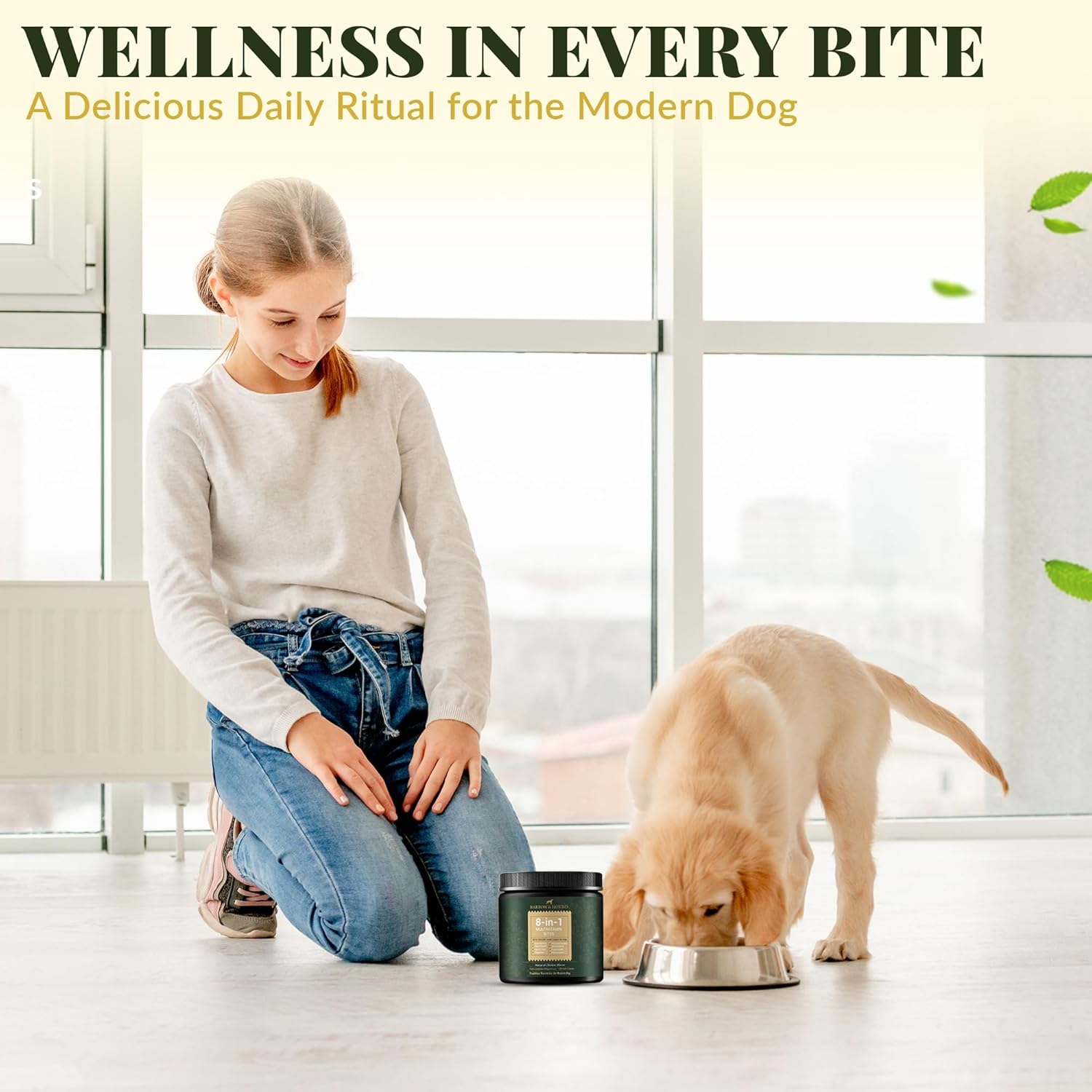 About this item 8-in-1 Complete Formula for Daily Dog Wellness Packed with essential nutrients, our multivitamin chews support 8 core areas of your dog’s health: joint function, heart health, immune system, digestion, liver support, skin & coat, antioxidant protection, and performance. All-in-one daily supplement for dogs of all breeds, sizes, and ages. Joint, Bone & Mobility Support with Glucosamine + MSM Each chew includes Glucosamine HCl, MSM, and Chondroitin Sulfate to help maintain strong joints, support cartilage, and reduce stiffness. Ideal for active dogs, aging companions, and breeds prone to hip & joint issues. Supports Heart, Liver & Immune Function with Vitamins A–E & CoQ10 Formulated with essential vitamins (A, C, D, E, and B complex) plus powerful antioxidants like CoQ10 and folic acid to help reduce oxidative stress, promote liver detox, and maintain cardiovascular and immune health. Supports Heart, Liver & Immune Function with Vitamins A–E & CoQ10 Formulated with essential vitamins (A, C, D, E, and B complex) plus powerful antioxidants like CoQ10 and folic acid to help reduce oxidative stress, promote liver detox, and maintain cardiovascular and immune health. Promotes Healthy Digestion & Nutrient Absorption Our digestive complex features niacin, enzymes, and a 5-strain probiotic blend to support balanced gut flora and digestive comfort. Helps with food sensitivities, bloating, and stool consistency for healthier daily function. Natural Chicken Flavor – Grain-Free & Dog-Approved Tasty and easy to give, these soft chews are loved by picky eaters and gentle enough for seniors. Made without corn, soy, or artificial preservatives. Manufactured in an FDA-registered, GMP-certified facility for safe, clean canine nutrition. › See more product details