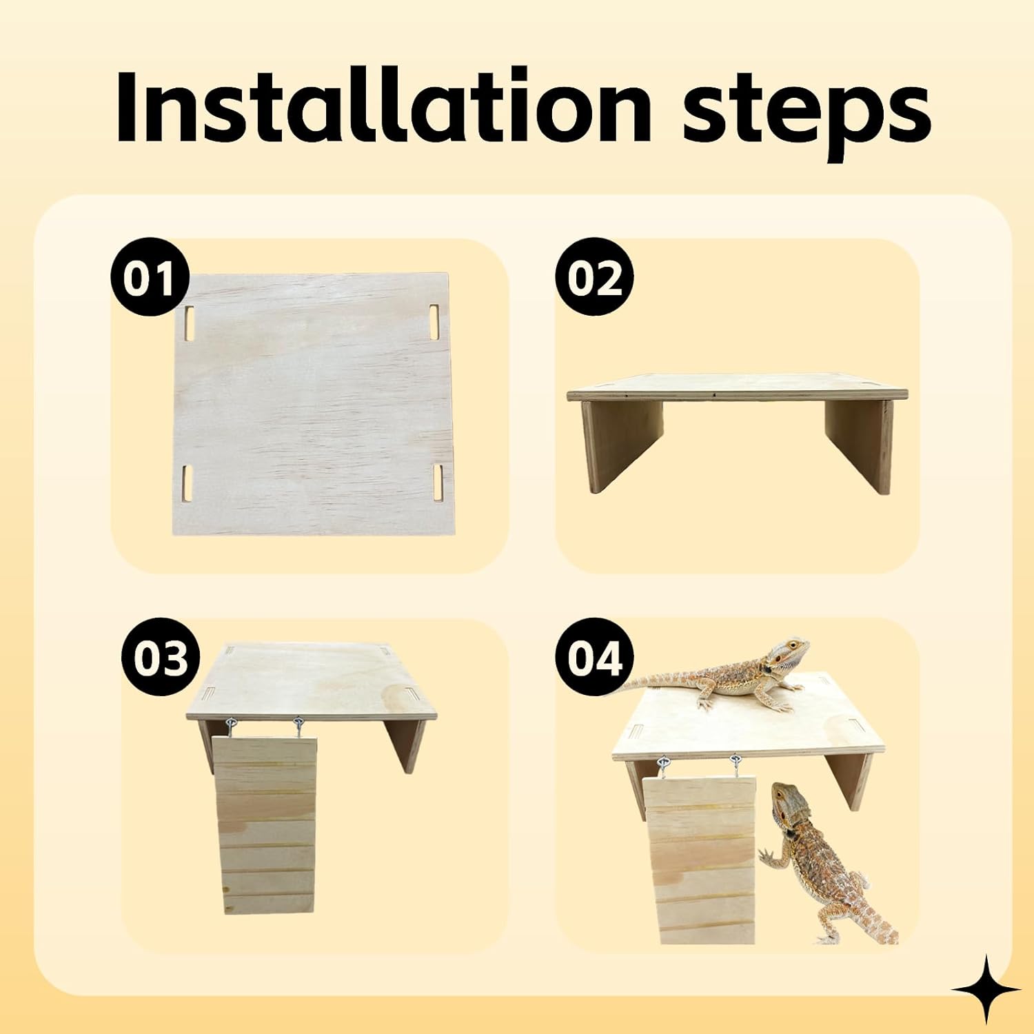 About this item 【Reptile Tank Accessories】: This 2-in-1 wooden habitat combines a spacious basking platform with a gentle climbing ramp to enrich your pet's environment. The open space beneath the platform serves as a secure hideout, fulfilling your reptile's instinctual need for both exploration and privacy 【Easy to Use】: Designed for simple assembly that requires no tools, allowing you to quickly set up a engaging new area in the tank; The modular pieces are easy to position and rearrange, helping you customize the layout to keep your pet's habitat interesting 【Habitat Hideout】: The enclosed space under the platform offers a perfect, shadowy retreat for resting and stress reduction; This essential feature helps create a more naturalistic and comforting environment for bearded dragons, geckos, skinks, and other small reptiles 【Durable and Safe】: Constructed from natural wood, this accessory is sturdy and safe for your pets; It provides a stable and textured surface for climbing and basking, supporting their natural behaviors without the risk of sharp edges 【Wide Application】: An ideal all-in-one decor piece for a variety of terrariums and reptile enclosures; Its natural look complements different habitat themes, making it a versatile choice for owners of lizards, snakes, and other small pet animals › See more product details