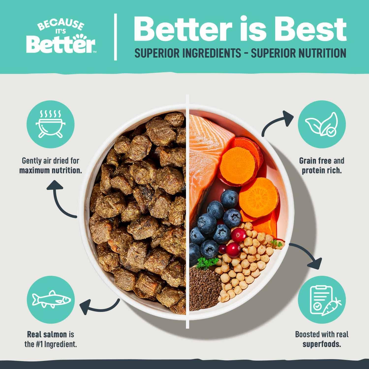 Better nutrition starts with healthy, nutrient-rich recipes. That’s why our Because it’s Better Air Dried recipes start with high-quality, premium proteins like beef, chicken or salmon as the #1 ingredient, and wholesome superfoods like pumpkin to support healthy digestion and blueberries to support healthy immunity. Unlike harsher processes that strip nutrients, our gentle air-drying method safely preserves the nutritional integrity and natural taste of our ingredients for a meal you and your pup can both get excited about.