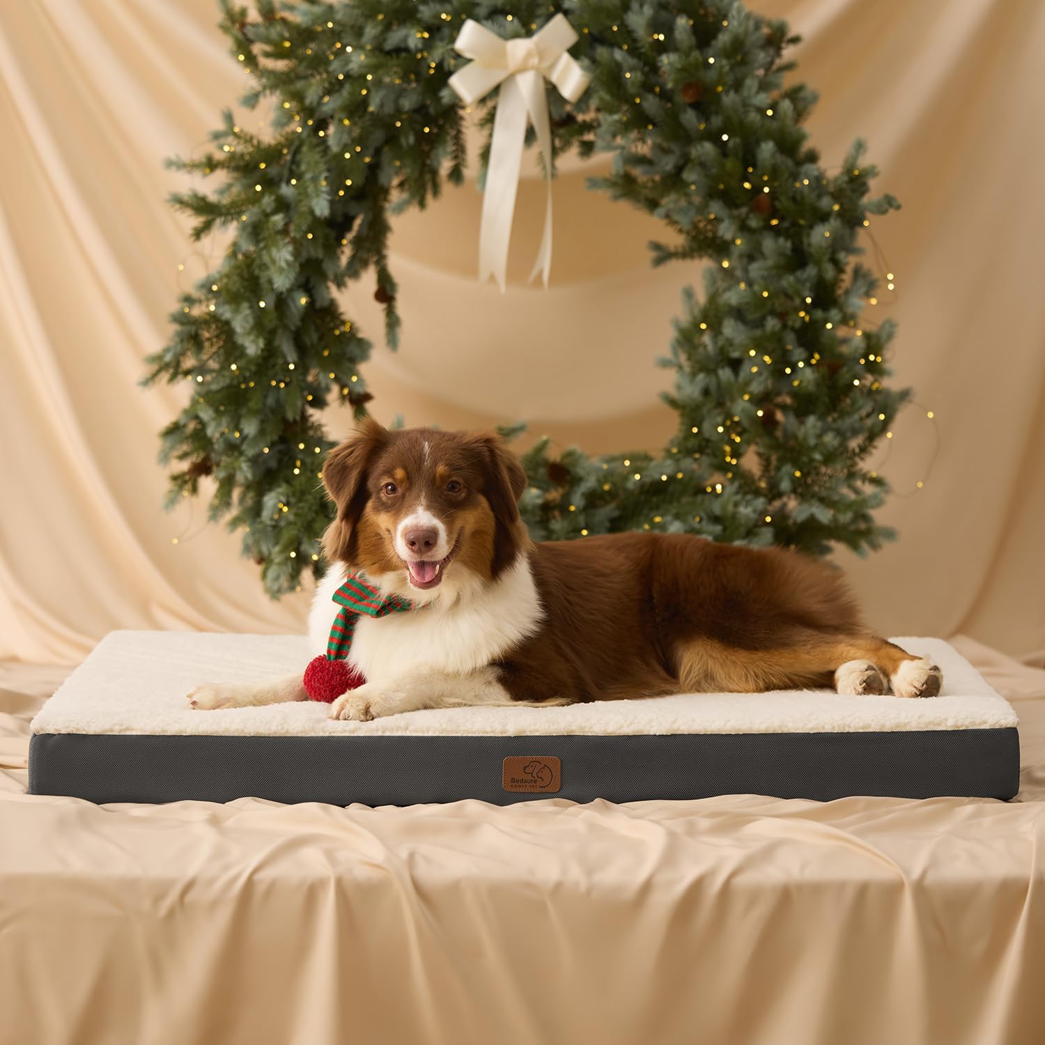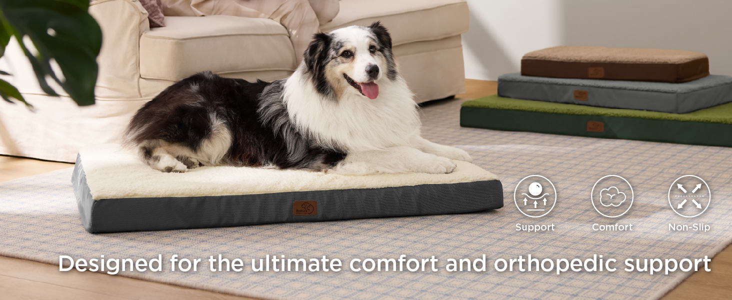 About this item Cloud-Soft Comfort: This comfy dog bed is made from 200gsm medium-weight sherpa fleece. Dense, skin-friendly fabric makes it suitable puppy bed, dog mat, or dog crate bed. Designed to promote restful sleep Unzip, Wash, Done: This easy-clean dog bed comes with an easy-to-remove, machine washable cover. Simply unzip, toss the cover into your normal wash cycle, and air-dry. The fabric resists fading and shrinking, wash after wash—so it stays looking and fitting like new, no matter how often it's cleaned. Tip: For best results, use a lint roller to remove pet hair before washing—especially on larger beds—to help the cover maintain its perfect condition Orthopedic Egg-Crate Support: This pet bed features high-density egg-crate foam. Raised points and dips that contour to your pet's body. This design eases pressure on joints and muscles, balancing soft comfort with firm support—ideal for everyday use and especially beneficial for senior pets, large breeds, or those with arthritis Pet-Safe & Anti-Slip: Crafted with CertiPUR-US certified foam and OEKO-TEX Standard 100 (24.HCN.46956) approved fabrics, this dog bed is free from over 1,000 harmful chemicals. A rubberized anti-slip bottom keeps the pet bed for large sized dogs or small size securely in place on any floor surface Perfect Fit for Every Pet & Place: Available in multiple sizes, each tailored to specific weight ranges. This versatile dog bed works in your home, on road trips, or outdoors. Every breed. Every lifestyle. Whether you need a dog beds large sized dog option, a compact dog crate bed, or a travel-friendly dog mat, there's a size made to match › See more product details