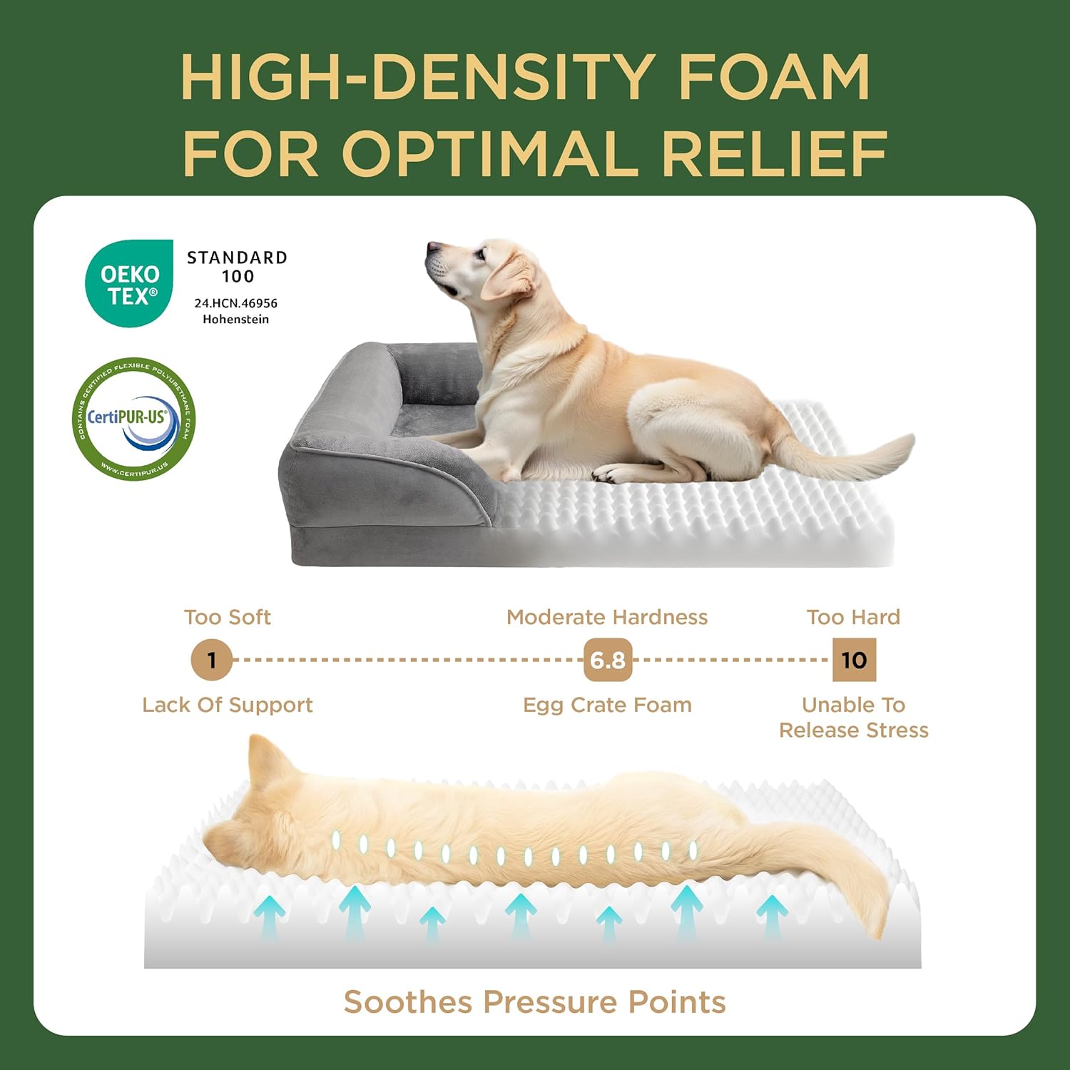 About this item Orthopedic Support: Our orthopedic cat sofa is designed to give your pet unparalleled support for a deep, dreamy sleep. High-density egg-crate foam helps distribute weight evenly and provides the perfect amount of pressure relief and joint support. Enhanced Comfort: The 4-sided bolster design promotes ultimate comfort and security, offering your pet a variety of cozy positions to snuggle. The cushioned bolster shape is deeply filled to support your pet’s head and neck for a more restful sleep. And the lowered entrance protects your pet's knees and promotes accessibility. Waterproof & Easy Care: The durable foam mattress is encased in a waterproof liner to fully protect the foam from spills, water damage, or accidents. Remove the zippered cover in seconds and machine wash for easy care. Tested & Pet Approved: This supportive Pet bed is wrapped in our velvety soft flannel fabric, offering soothing comfort that your furry friend will find cozy and relaxing. Pet Safe Materials: This standard 100 by OEKO-TEX(24.HCN.46956) certified pet bed consists of CertiPUR-US certified foam and luxurious flannel, creating a safe and comfortable space for your furry friend to rest and recharge. The non-skid bottom reduces slips and protects your dog. › See more product details