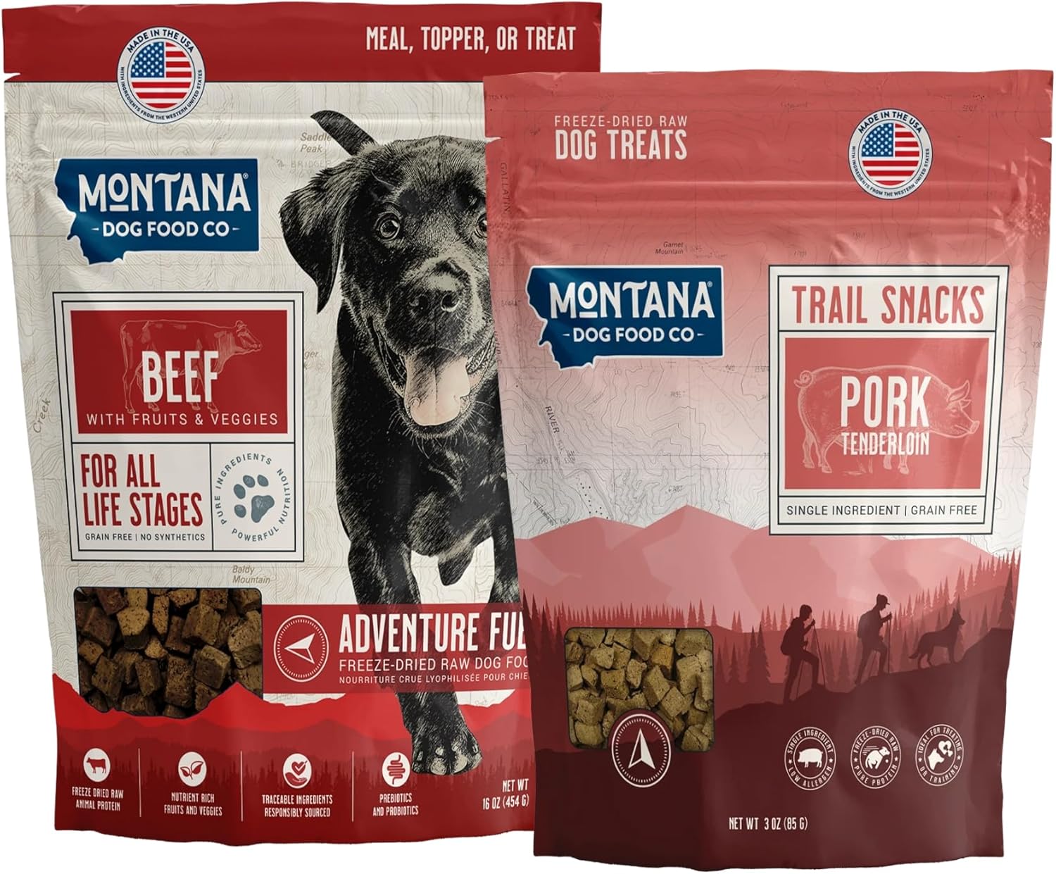 This Montana Dog Food Co. bundle includes our Beef Freeze-Dried Raw Dog Food (16 oz) paired with single-ingredient Pork Training Snacks. Crafted with USA-sourced ingredients, this convenient bundle provides complete nutrition and healthy, protein-packed treats perfect for training, rewarding, or everyday feeding.