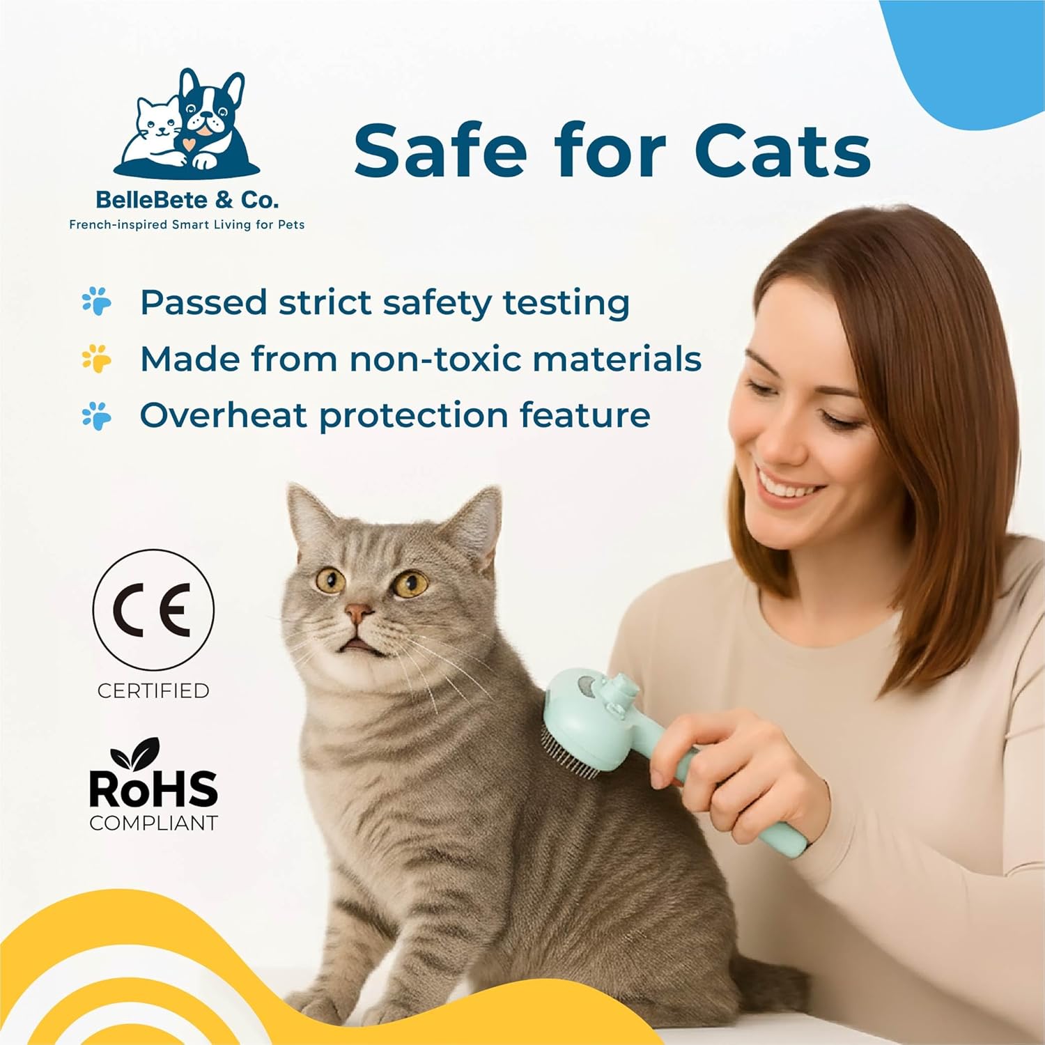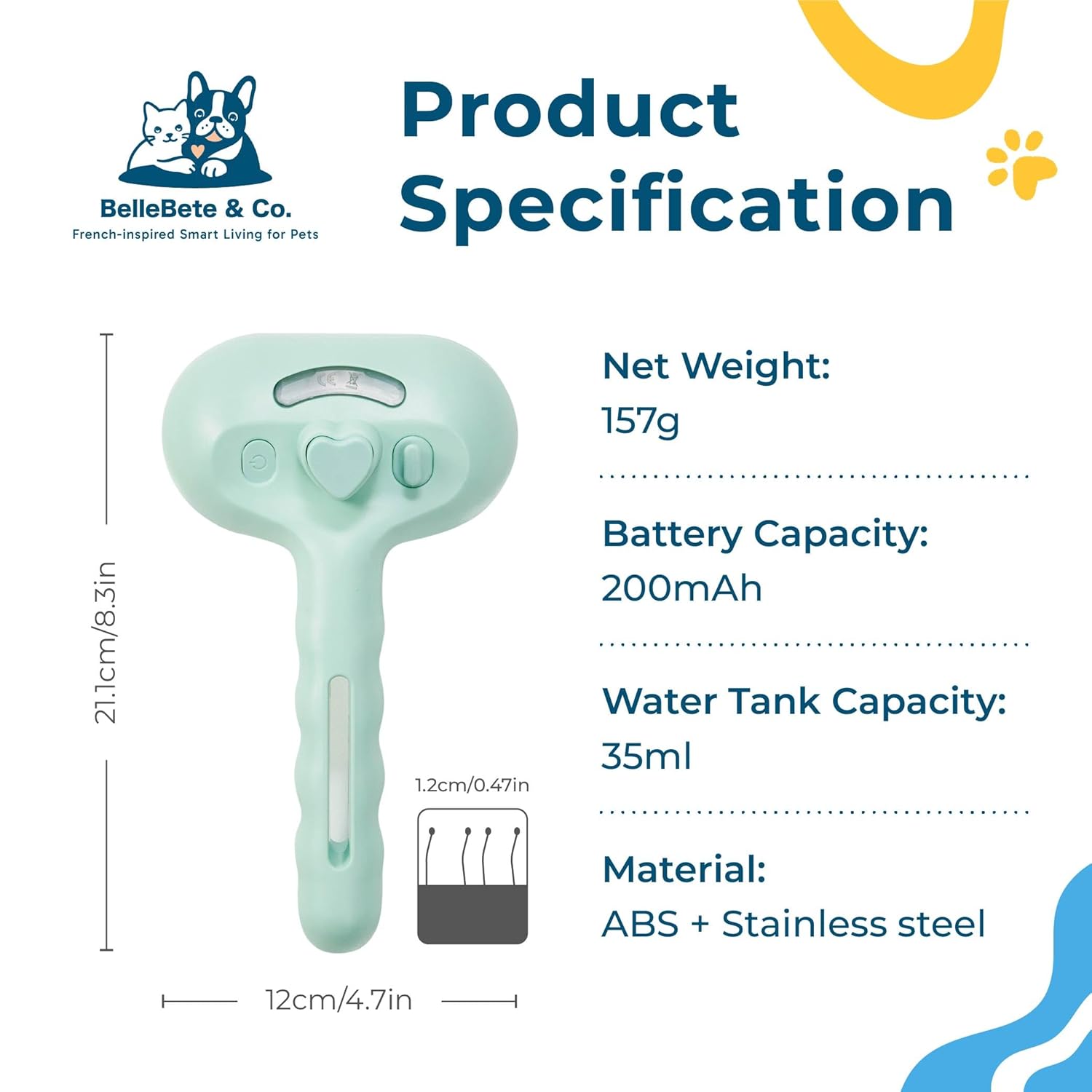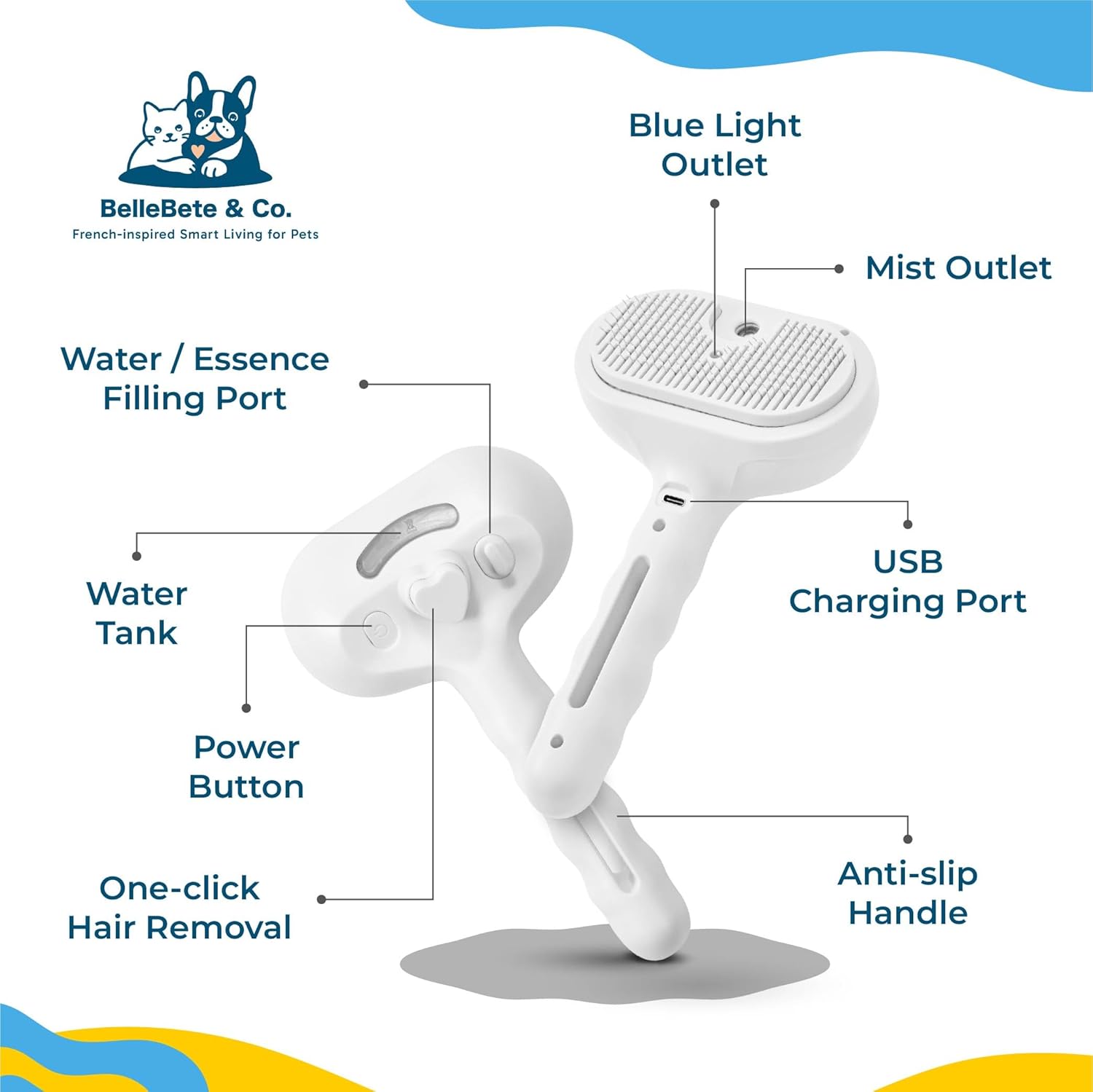 About this item Less Flying Fur at Home: Tired of fur floating everywhere? Our steam pet grooming brush uses advanced misting technology to gently soften and loosen shed hair, reducing flying fur by up to 90%. Whether you're grooming a fluffy cat or a double-coated dog, this pet steam de-shedding brush keeps both your home and your pet cleaner, calmer, and more comfortable. Innovative Blue Light Technology: Transform grooming time into spa time! The integrated blue light therapy soothes sensitive skin while promoting healthy coat growth and natural shine. This isn't just a deshedding tool—it's a complete pet wellness system that leaves your furry friend looking and feeling their best. No-Rinse Conditioning Magic: Skip the messy bath time battles! Our specially formulated conditioning mist disperses through steam, eliminating static electricity and preventing painful matting. Perfect for pets who panic at the sight of water! One-Click Self-Cleaning Design: Forget about pulling hair from brushes by hand. With only a single press, the unique push-button hair release instantly ejects collected fur with zero mess. This time-saving feature makes cleanup effortless! USB Rechargeable & Ergonomic Comfort: Groom anywhere, anytime! The cordless design with USB charging works perfectly for home and travel sessions. Ergonomic handle provides comfortable grip while reducing hand fatigue. Compatible with both long-haired and short-haired breeds, this versatile pet hair remover is your go-to solution! › See more product details