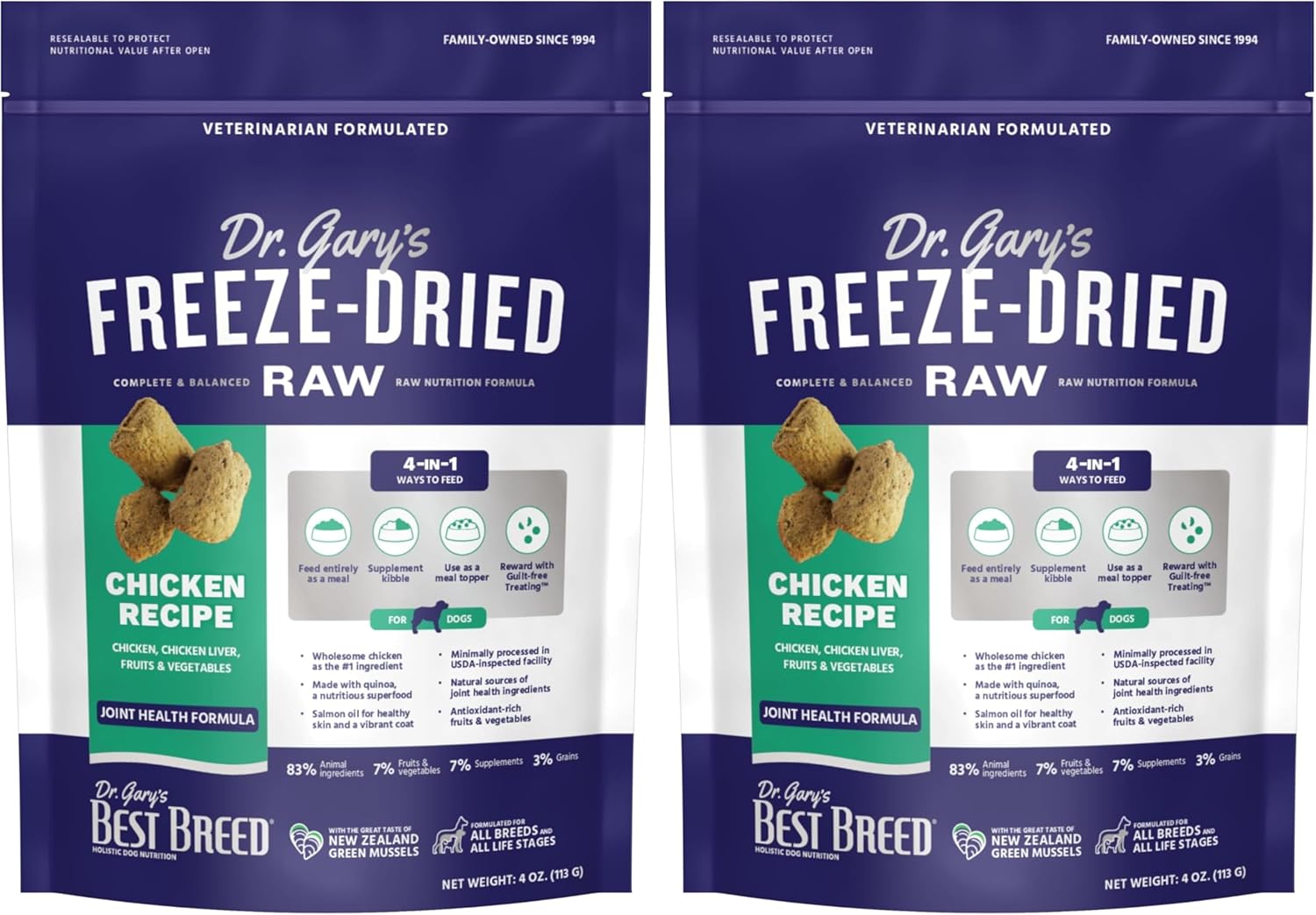 About this item The information below is per-pack only USA-SOURCED CHICKEN supplies premium and concentrated protein used for lean muscle growth and development. 4-in-1 WAYS TO FEED: Feed entirely as a meal | Supplement kibble | Use as a meal topper | Reward with guilt-free treating NATURAL JOINT CARE with sources of glucosamine. Also includes the Green-lipped Mussel sustainably raised off the pristine shores of New Zealand and supplier of many health promoting nutrients. FORMULATED FOR SKIN HEALTH with salmon oil rich in the omega-3 fatty acids needed for nourishing skin and coat. MANY NUTRIENT-DENSE INGREDIENTS including quinoa, a gluten-free superfood packed with protein, zinc, fiber and folate. › See more product details