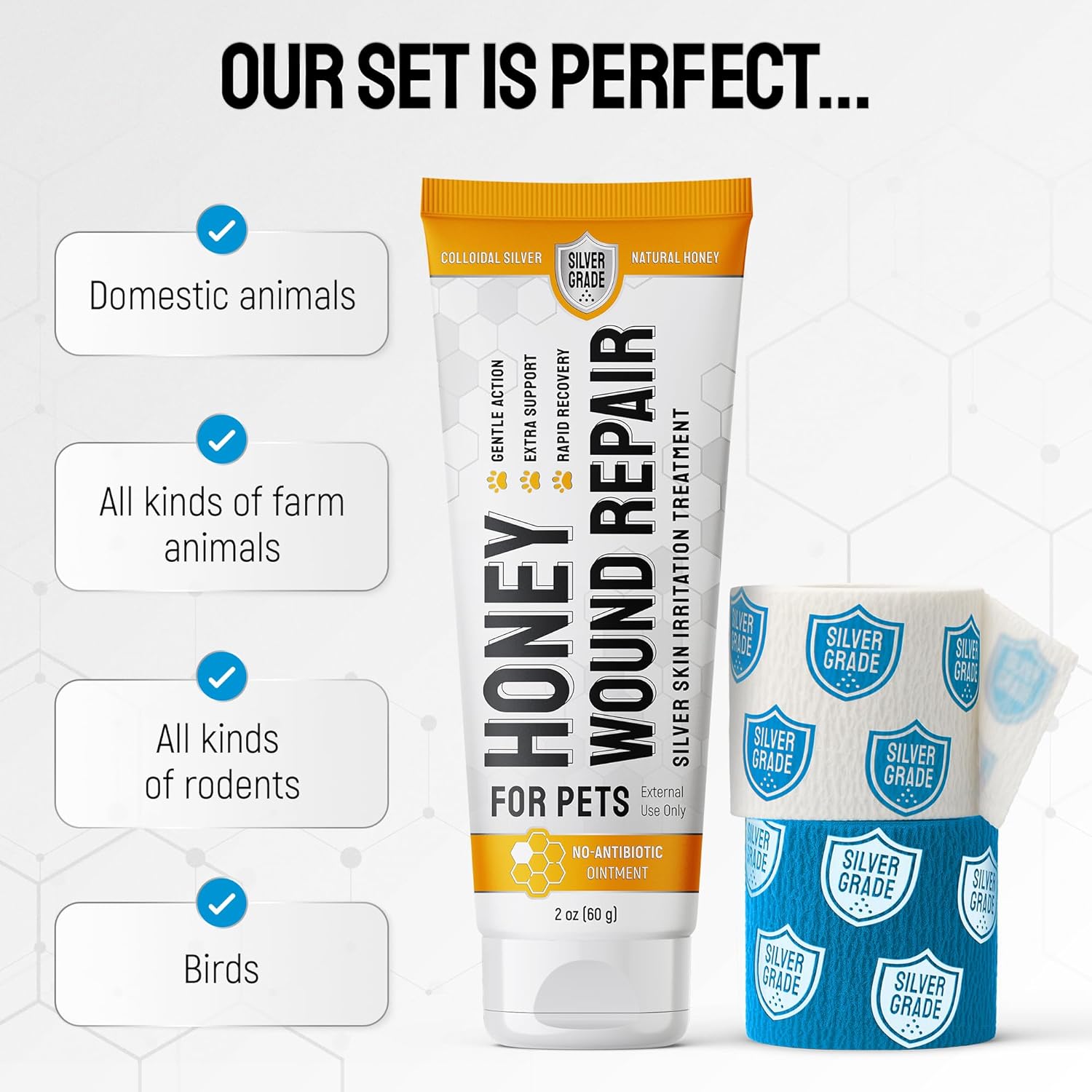 Every pet needs care and support, which is why we created a convenient set of two products: Honey Wound Repair ointment in gel form and 2 Bandages. It is ideal for horse wound care, dog rash treatment, cat skin irritation treatment, and other small and large animals. It's a quick solution for all skin conditions, featuring natural and safe components. The main benefits: Two products – our Honey Wound Repair gel and 2 bandages provide comprehensive support. Non-sting formula – our gel gently cares for your pet's skin without irritating it. Formulated for all pets – horses, cats, dogs, and other animals can benefit from our gel. Natural compound – our set is crafted from safe ingredients and is suitable for small pets, as it is free from additives. The mode of application: 1. Clean the skin from dirt and trim it of the debris. 2. Apply a thin layer of gel to the wound and cover it with a sterile dressing. 3. Allow the gel to absorb, then apply a bandage. Try to wrap it not too tightly. 4. Ensure the bandage is dry; otherwise, change it if needed. Shine bright, beloved pet! – Exceptional silver care!