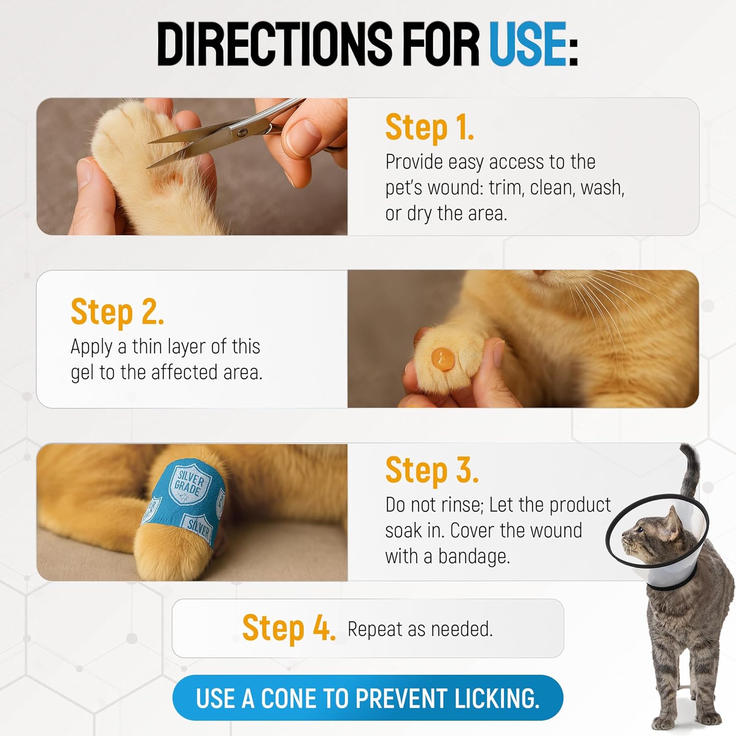 - Directions: Provide easy access to the pet’s wound (clean, wash, dry, or trim coat). Apply a thin layer of this gel to the affected area. Cover the wound with a bandage.