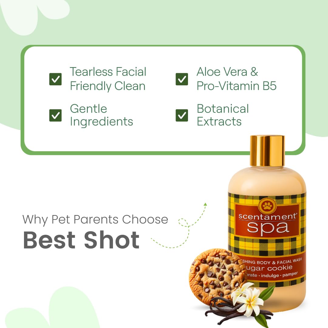 Keep your pet clean, fresh, and happy with this pet gentle facial wash, specially formulated for sensitive skin. Enriched with vitamins and silk proteins, it provides deep cleansing and conditioning without irritation — a must-have in your dog grooming supplies. Acting as a dual-purpose dog tear stain remover and face wash, it helps eliminate discoloration around the eyes and muzzle, leaving your dog’s face bright, white, and clean. The delicious aroma of cookie dough, lemon zest, buttercream, and cinnamon sugar gives your pet a fresh, pleasant scent after every use, making grooming time enjoyable for both of you. Perfect for busy pet owners, this waterless dog wash offers a convenient solution to keep your furry friend spotless between baths. Simply apply and wipe away — no rinsing needed. Designed with comfort in mind, the pet gentle formula ensures your dog stays calm and relaxed throughout the process. Give your pet the ultimate dog grooming experience with this refreshing and soothing facial wash.