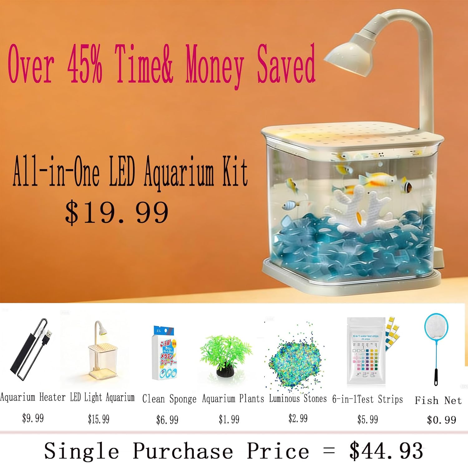 - Included Components: artificial aquatic plants, moonstone, pearl, small fish net, small fish tank with light 6-in-1 aquarium test strips