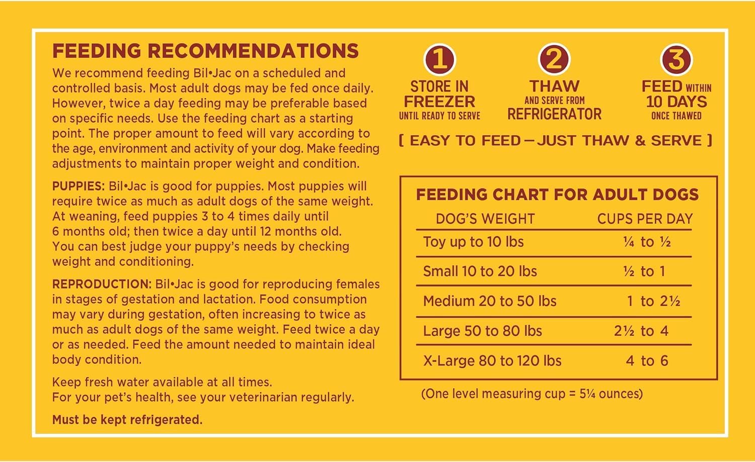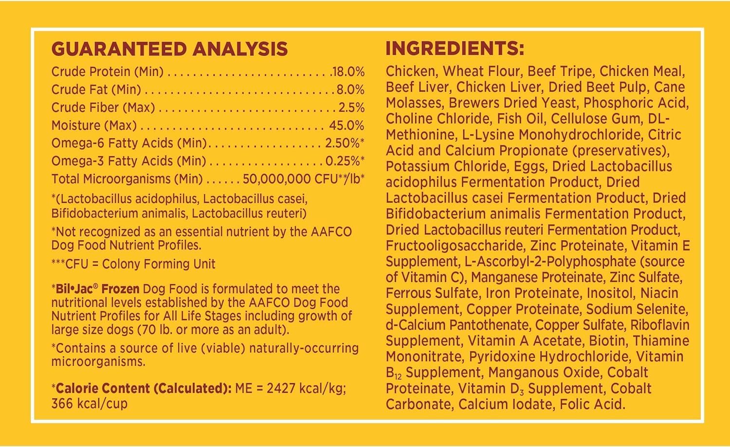 About this item The Original Frozen Dog Food - Utilizes high-quality fresh, real chicken in its formulation as the first ingredient - with wholesome ingredients & gentle cooking process to preserve vital nutrients and fresh taste, Bil-Jac has all the essentials your dog needs with a great taste they will love as a complete meal or as a treat or dog food topper. Improved Formula with Same Great Taste - Now with probiotics and prebiotics for healthy digestion. No filler for complete and balanced nutrition. Wholesome grains and a gentle fiber blend provide energy and vitality with a healthy gut. Nourishes Skin & Coat - Naturally sourced Omega 3 & 6 fatty acids and high protein to help support strong muscles and a replenish your dog's skin and coat Why Frozen? - Bil Jac frozen dog food is naturally preserved by freezing and uses no fillers, with a formulation so unique it's been granted two US Patents. Super Premium - Bil-Jac dog treats and dog food are made in USA since 1947 under a slow-cooked process using wholesome grains containing antioxidants and fresh chicken. Bil-Jac takes a different approach to feeding your best friend. › See more product details