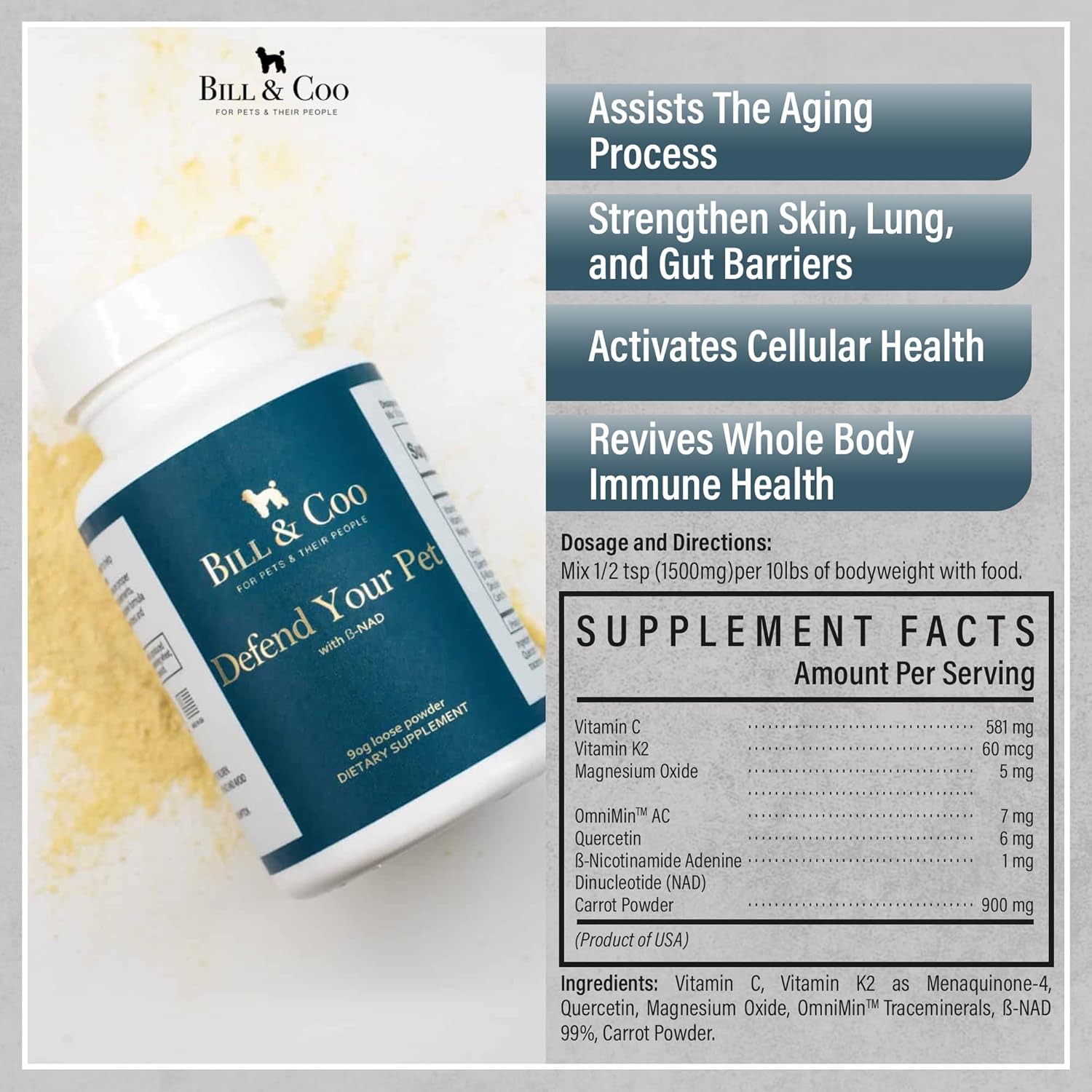 Give your pets the ultimate wellness upgrade with the BILL & COO Complete Pet Wellness Bundle! This 3-in-1 set includes our bestselling Anigreens Prebiotic & Probiotic Formula and Defend Your Pet B-NAD Supplement, carefully designed to support your furry friend’s digestive, immune, and cellular health from the inside out.✔ Digestive Balance & Comfort: Packed with premium prebiotics, probiotics, and dietary fibers that nourish beneficial gut bacteria, this formula helps maintain smooth digestion and reduces occasional discomfort.✔ Immune Strength & Vitality: Enriched with vitamins C, D, and K2 along with natural antioxidants, these supplements enhance your pet’s immune defense against environmental and seasonal stressors.✔ Cellular Health & Longevity: The powerful B-NAD and resveratrol blend promotes healthy DNA function and supports anti-aging processes—keeping your pet active, bright, and full of life.✔ Easy to Use Every Day: Simply mix the fine powder into your pet’s regular meal for a fuss-free way to maintain daily nutrition and overall wellness. Perfect for dogs and cats of all sizes.BILL & COO believes in science-backed care and clean nutrition for pets. With every bundle, you’re giving your pet the gift of balance, energy, and long-lasting health.