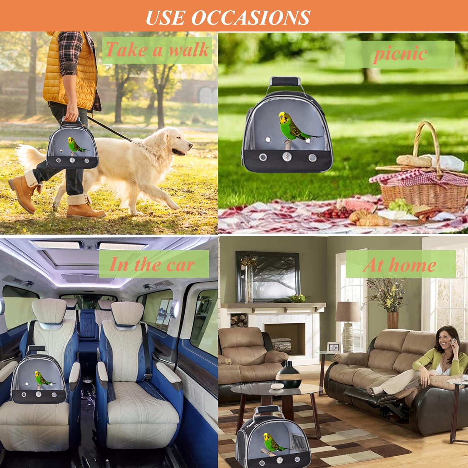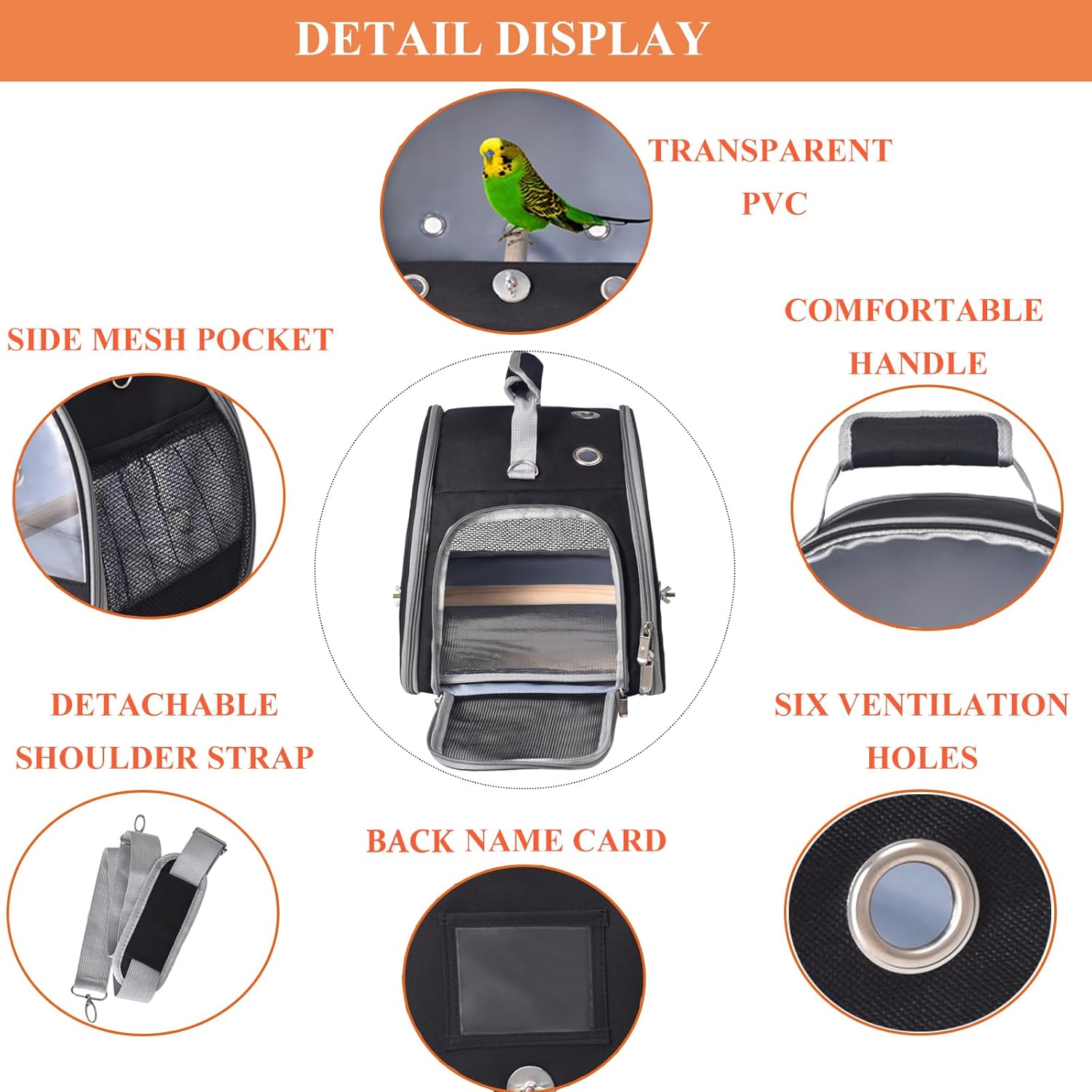 About this item 1.Big Transparent Window: There is a large transparent window made of PVC in the front of the bird carrier bag. This clear window allows small pets to see the scenery outside during their travels, and you can keep an eye on your pets at all times 2.Five-sided Ventilation System: There are 6 ventilation holes located on the front, back and top of the small pet carrier bag, and two mesh windows on the left and right. This breathable enclosed environment ensures the safety and comfort of the animal 3. Left Mesh Window, Right Mesh Pocket: The double zipper mesh window on the left side of the bird cage makes it easier for you to place food or touch it. And the outside big mesh pocket is excellent to store food, toys, water bottles 4. Food-grade Aluminum Foil Tray: This bird travel case is equipped with a quality tray whose surface material is aluminum foil. Two main characteristics of aluminum foil material are waterproof and easy to clean Bird carrier travel cage bird travel carrier small bird carrier travel bird cage parakeet parrot carrier backpack small bird cage bird cages for parakeets › See more product details