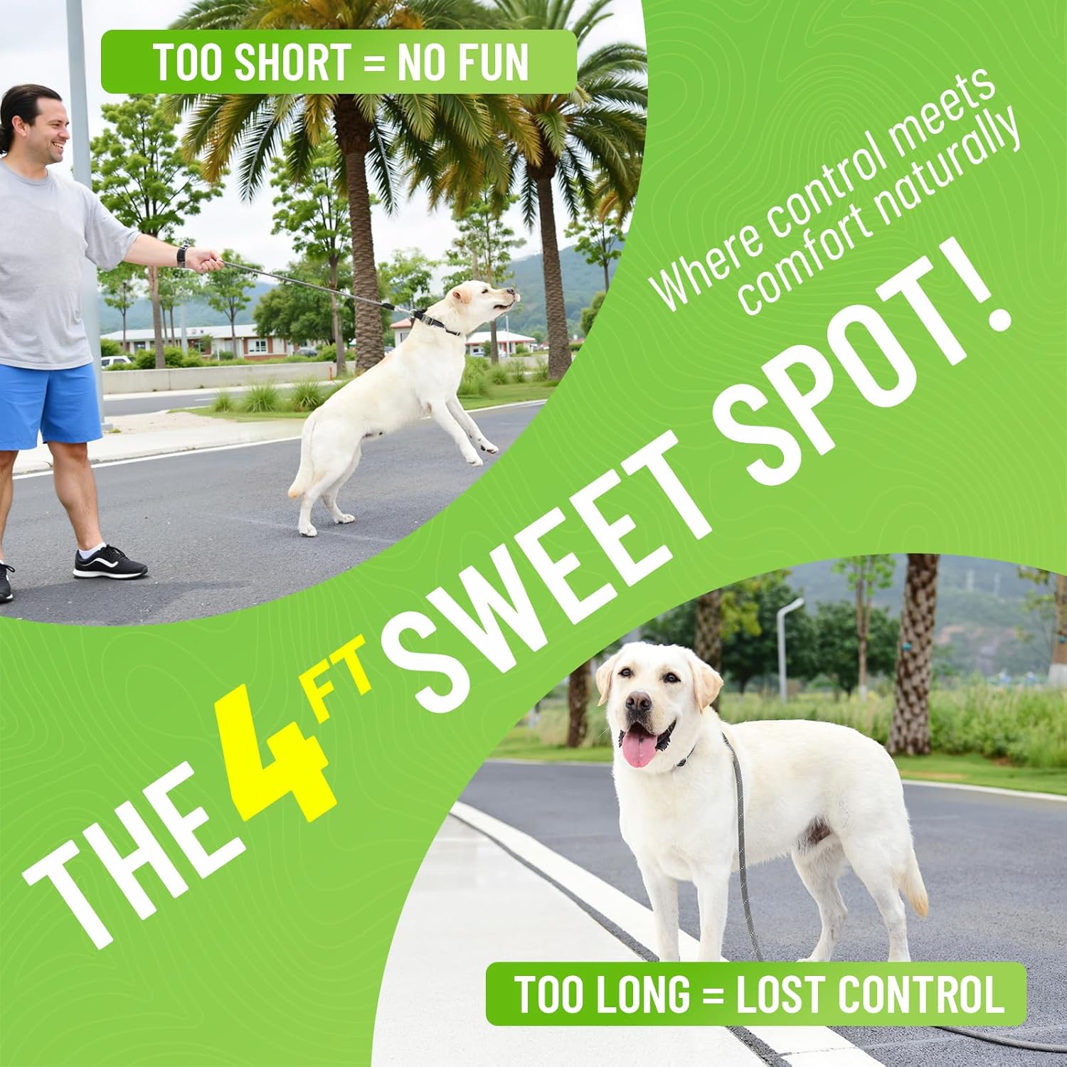About this item HEAVY DUTY 440LBS TENSILE STRENGTH-Cross weave nylon construction withstands intense pulling from Labrador Retrievers, German Shepherds & large breed dogs. Engineered to handle dog training sessions and sudden pulls during walks, our strong dog leash exceeds standard 200kg dynamic force requirements. ZINC ALLOY LOCK-Features heavy-duty swivel clip with one-handed secure closure mechanism. Against 200kg sudden pulls, maintains integrity when dogs chase squirrels or lunges during park outings. Superior corrosion resistance vs standard plastic buckles - won't snap like cheaper dog leashes even after repeated saltwater exposure. 360° NIGHT VISIBILITY SYSTEM-Interwoven reflective threads shine brighter than regular leashes under car headlights. Crucial for nighttime dog walking in urban areas or tracking dark-coated breeds in low-light conditions. Keeps you and your dog seen during late-night walk or early morning jogs. ENHANCED ANTI SLIP SURFACE-High-density T-weave Outer Layer provides maximum grip even with wet hands. Specially designed thread texture pattern mimics climbing rope dog leash surfaces, maintaining control during sudden pulls from German Shepherds or determined retrievers. It also resists fraying from daily use in city sidewalks or beach. LEATHER WRAPING-Leather wraps critical junctions where heavy duty leashes for large breed dogs need. Cowhide wrapping and stitching to avoid separation at connection points during outdoor activities, able to handle 200kg dynamic force from Alaskan Malamutes or energetic Goldens. COMFORT FOCUSED SBR CUSHIONING-shock-absorbing foam core reduces hand fatigue during extended walks with large dogs. The ventilated inner layer wicks sweat faster than standard padded dog leash handles, ideal for summer jogging with Huskies or humid climate use. Ergonomically contoured to align with natural palm curvature. 360° TANGLE FREE SWIVEL- Reinforced zinc alloy pivot rotates smoothly to eliminate leash twisting during outdoor adventures. Proven effective for dogs that circle during walks or sudden direction changes at the park. Corrosion-resistant construction withstands beach outings/rainy day walks, maintaining consistent performance after long-term use. IDEAL 4FT LEASH LENGTH-Designed through urban dog walk observations, this heavy-duty leash for medium to large dogs balances freedom & control. Allows 1.2m sniffing radius while keeping pets within safe reach on busy sidewalks. The strategic 4-foot dimension avoids over-stretching compared to standard 6ft dog leashes in crowded areas. PREMIUM WHITE CORE NYLON ROPE-Able to withstand tensile strength of 440lbs (200kg), using uniform-density nylon fibers versus cheaper multi-color mixed cores. The 1.2cm diameter double-layer construction resists abrasion from concrete/asphalt surfaces, ideal for daily walks with Rottweilers or Alaskan Malamutes. REINFORCED BITE RESISTANCE-Compared to basic rope leashes prone to fraying, our heavy-duty dog leash uses double-layer nylon with abrasion-resistant stitching. Targeted protection at common chewing zones enhances longevity for persistent pullers during daily walks or obedience training with medium to large breed dogs. Show more › See more product details