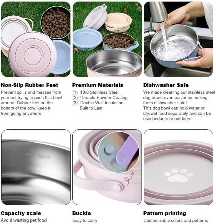 About this item 🐾 ALL-IN-ONE TRAVEL DOG BOWL SET – FOOD, WATER & STORAGE IN ONE 🐾 Premium 3-in-1 dog travel bowl set includes a 30 OZ stainless steel dog bowl for food, a 20 OZ collapsible silicone water bowl that doubles as a spill-proof lid, and a slow feeder insert – perfect for travel, camping, hiking, and everyday use. 🐾 SLOW FEEDER INSERT – PREVENTS CHOKING & PROMOTES HEALTHY DIGESTION 🐾 Designed for fast eaters, the anti-choke slow feeder dog bowl insert with strong suction cups encourages slower eating and reduces the risk of bloating, vomiting, and indigestion. Ideal for small, medium, and large breeds 🐾 PORTABLE & COLLAPSIBLE – LIGHTWEIGHT, COMPACT, TRAVEL-READY 🐾 Features a collapsible BPA-free silicone bowl for water, plus a leak-resistant lid for secure transport. Easily folds into a compact size – a must-have for dog camping gear, road trips, or outdoor dog feeding. 🐾 ADDITIONAL - BOTTLE & POOP BAG HOLDER WITH CARABINER CLIP 🐾 Stay organized on the go! The included silicone holder fits a standard water bottle or poop bags and attaches easily to leashes or bags with the carabiner clip. Great for walks, hikes, and travel with dogs. 🐾 SAFE, DURABLE & NON-SLIP – BUILT FOR DAILY USE 🐾 Made with rust-resistant stainless steel and BPA-free food-grade silicone, this non-slip dog bowl set stays in place on any surface. Easy to clean, Top Rack dishwasher safe, and safe for all dogs and puppies. 🐾 AVAILABLE IN 3 STYLISH COLORS – PINK, BLACK & BLUE 🐾 Choose a dog bowl set that matches your pet's personality. Stylish and practical, this outdoor dog bowl set is designed for convenience, health, and mess-free travel. 🐾 BONUS: FREE SILICONE FINGER TOOTHBRUSH INCLUDED FOR EASY PET DENTAL CARE 🐾 Helps maintain your pet’s oral hygiene by gently removing plaque and food debris, reducing bad breath, and supporting overall dental health. › See more product details