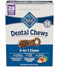 Reshape your dog’s daily dental routine with BLUE Dental Chews. Formulated with veterinary guidance, this natural dog treat offers a three-in-one clean. As your dog chews, 50 unique ridges and grooves support plaque and tartar control, spearmint flavor freshens breath, and a special shape promotes healthy teeth and gums. BLUE Dental Chews are made with the chicken dogs love. They contain no meat or bone meal, no artificial flavors or preservatives, and no corn, wheat, or soy, so you can feel good about treating your pup. A four-week supply, this 28-count pack of small daily chews is perfect for dogs weighing between five and 20 pounds. Give one treat per day to keep your dog’s mouth happy and healthy — and give yourself one more excuse to snuggle up to your pup! BLUE Dental Chews are intended for intermittent or supplemental feeding only. BLUE Dental Chews are brought to you by Blue Buffalo, the leader in natural pet food. LOVE them like family. TREAT them like family.