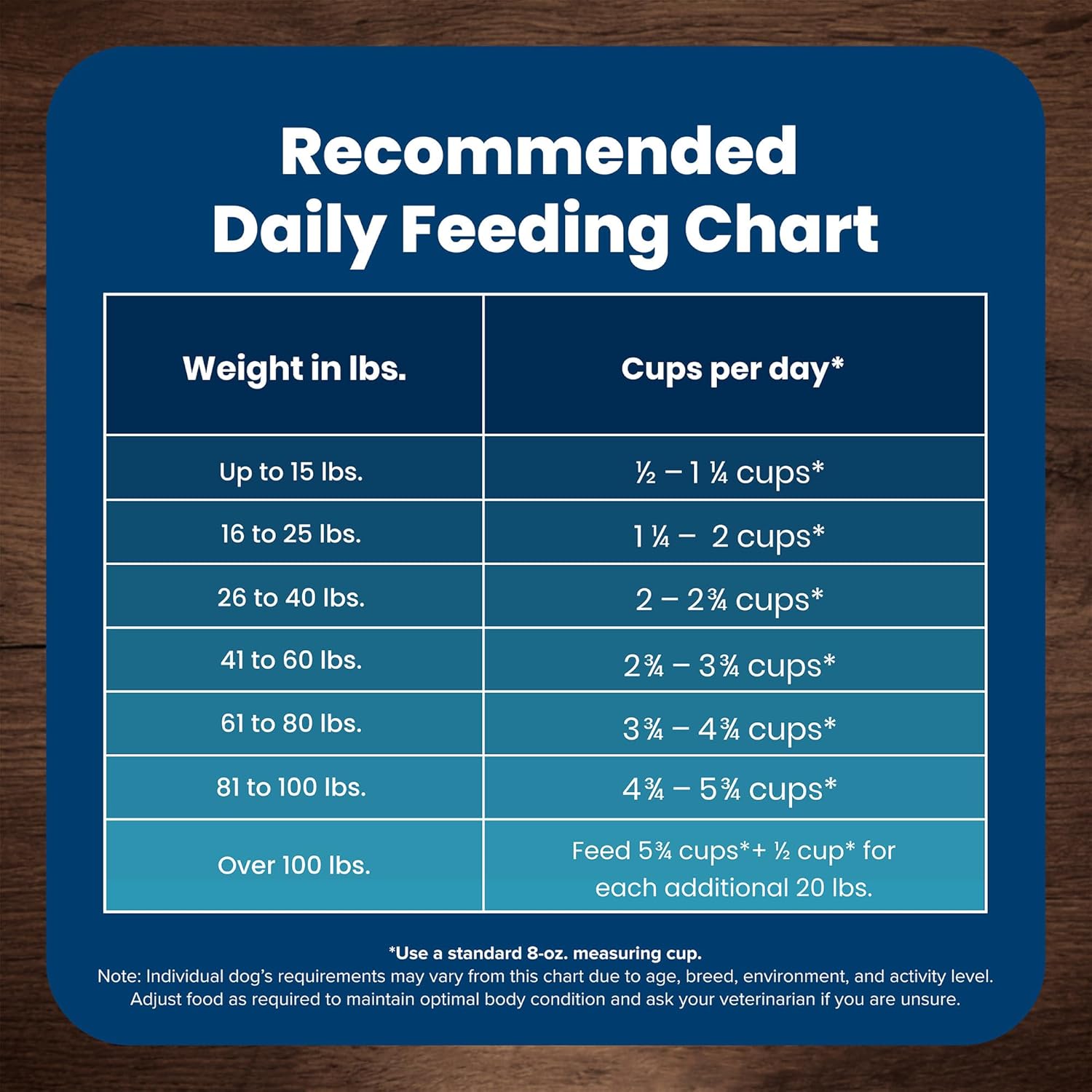 - Directions: Up to 15 lbs. 1/2 – 1 ¼ cups* 16 to 25 lbs. 1 ¼ – 2 cups* 26 to 40 lbs. 2 – 2 ¾ cups* 41 to 60 lbs. 2 ¾ – 3 ¾ cups* 61 to 80 lbs. 3 ¾ – 4 ¾ cups* 81 to 100 lbs. 4 ¾ – 5 ½ cups* Over 100 lbs. Feed 5 ½ cups* + ½ cup for each additional 20 lbs. *Use a standard 8-oz. measuring cup. Note Individual dog's requirements may vary due to age, breed, environment, and activity level. Adjust food as required to maintain optimal body condition, and ask your veterinarian if you are unsure.