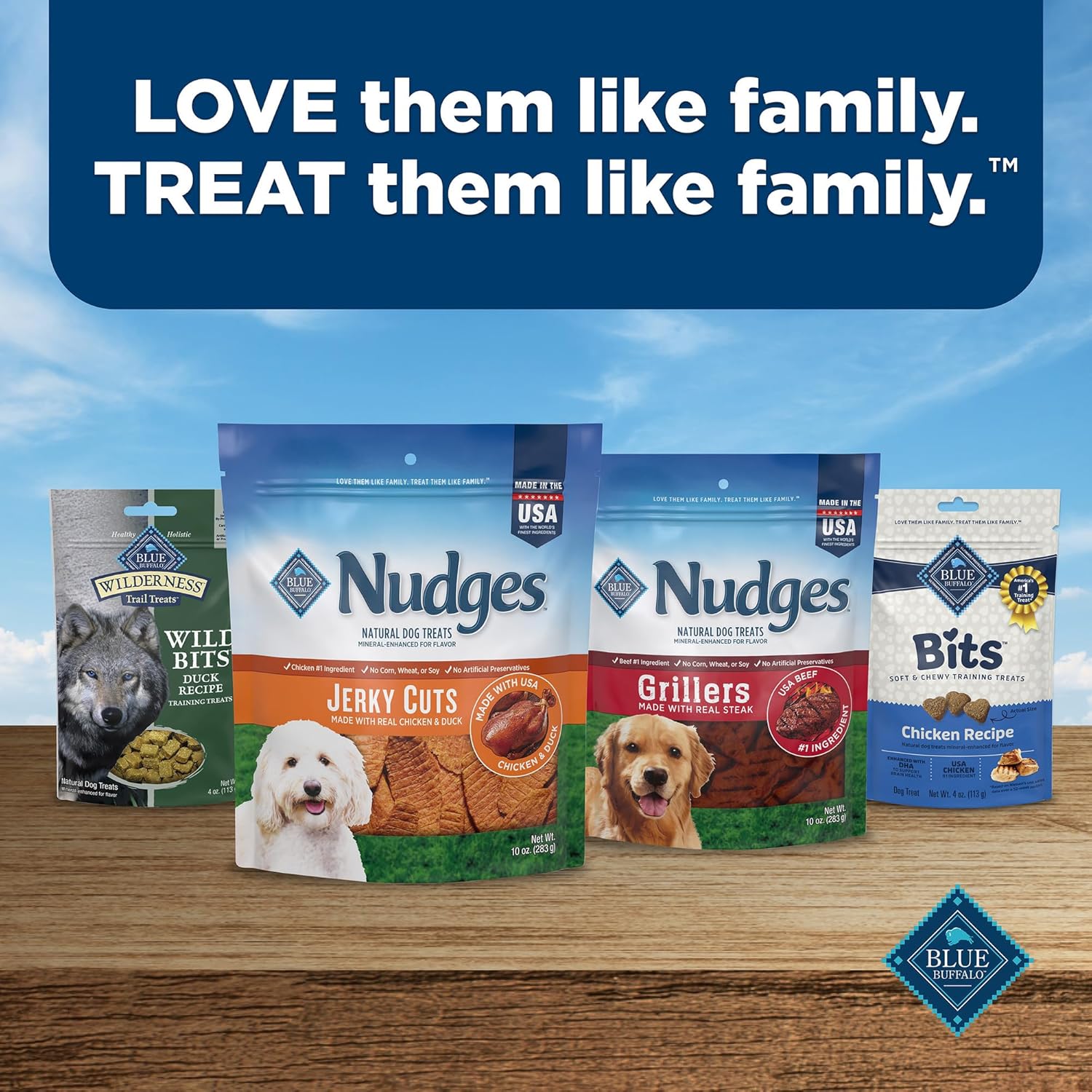 BLUE Nudges Jerky All Natural Dog Treats are oven-dried and easy to tear, making them great for dogs of all breed sizes and ages. These dog jerky treats offer tender, tasty morsels of real USA chicken that your pup will go wild for. And like all Blue Buffalo dog treats, these treats for dogs don't contain chicken (or poultry) by-product meals and are free of corn, wheat, and soy. Plus, they're free of artificial preservatives and colors, so you can feel confident you are giving your dog snacks made with healthy, wholesome ingredients that you'll enjoy giving them as much as they like eating them.
