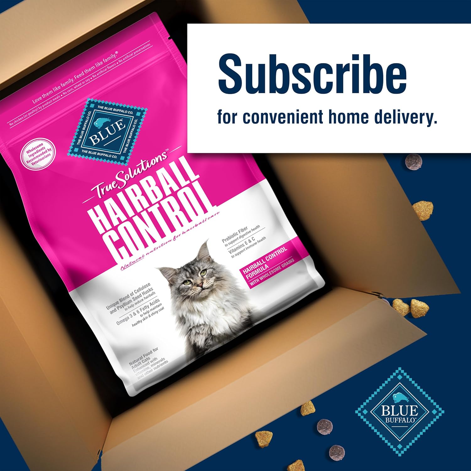 BLUE True Solutions Adult Hairball Control Dry Cat Food is created by PhD animal nutritionists and veterinarians with ingredients clinically proven to support your cat's specific health needs. This recipe is formulated with cellulose and psyllium seed husks to help reduce hairballs, prebiotic fiber to support digestive health, and Omega 3 and 6 fatty acids to support skin and coat health. What's more, this dry cat food is made with real, high-quality chicken as the first ingredient. Like all Blue Buffalo natural cat food recipes, BLUE True Solutions contains no chicken (or poultry) by-product meals. It is also free of corn, wheat, soy, artificial flavors, and preservatives.