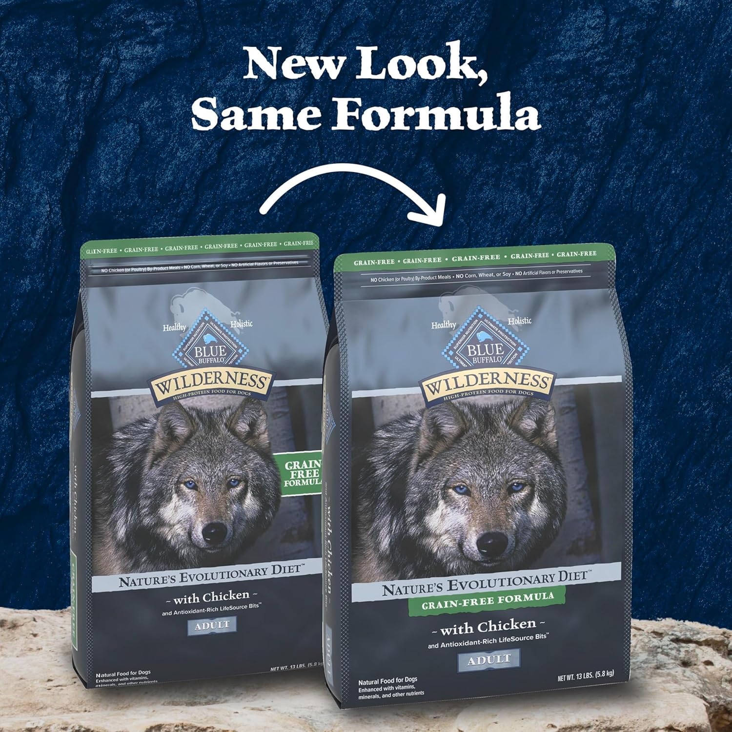 Like their ancestors before them, dogs were born to love meat. That’s why BLUE Wilderness high-protein dog food is packed with the meat dogs crave. With delicious real chicken as the first ingredient, Blue Buffalo Wilderness Natural Grain-Free Dry Food for Adult Dogs, Chicken Recipe provides natural, balanced nutrition to help your dog thrive while satisfying their wild side. This protein-rich, grain-free formula contains fats, complex carbohydrates, fruits, and vegetables for wholesome, well-rounded nutrition without the grains some Pet Parents choose to avoid. High-quality protein from deboned chicken helps your dog maintain strong, healthy, lean muscles. BLUE Wilderness dog foods are backed by the True BLUE Promise and always start with real, high-quality meat, poultry, or fish. They contain no chicken or poultry by-product meals, no corn, wheat, or soy, and no artificial flavors or preservatives. BLUE Wilderness is brought to you by Blue Buffalo, the leader in natural pet food. Love them like family. Feed them like family.