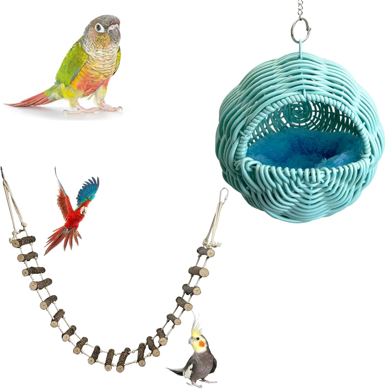 The combination of Wooden long Bird Ladders and blue rattan bird nest is a good choice for newbie starter parents!Wooden Bird Ladders Features:1.20 Rungs Wood Bird Ladder Bridge: BNOSDM wood Bird Ladder adopts an extended design, meeting the climbing and swinging activities of your feather friends.2.Natural Materials: BNOSDM bird rope ladder is made of fruitwood and has a stable structure. 3.Flexible Design: BNOSDM wooden bird climbing ladder measures 39.4x3.9 inches and can be freely adjusted according to the size of the cage.Blue Rattan Bird Nest Features:1.Unique Design: The round shape and elegant rattan weaving of our bird nesting provide a cozy and stylish environment for your pet birds.2.Excellent Craftsmanship: Crafted using traditional rattan weaving techniques, this finch bird house ensures tightly woven structure.3.Materials: Made from safe, durable, and easy-to-clean materials, our bird nest for cage swing House is designed for convenience, allowing for quick drying.Product List:1x Wooden Bird Ladders1x Blue Rattan Bird NestSpecification:39.4x 3.9 in/ 5.7x 6.1in
