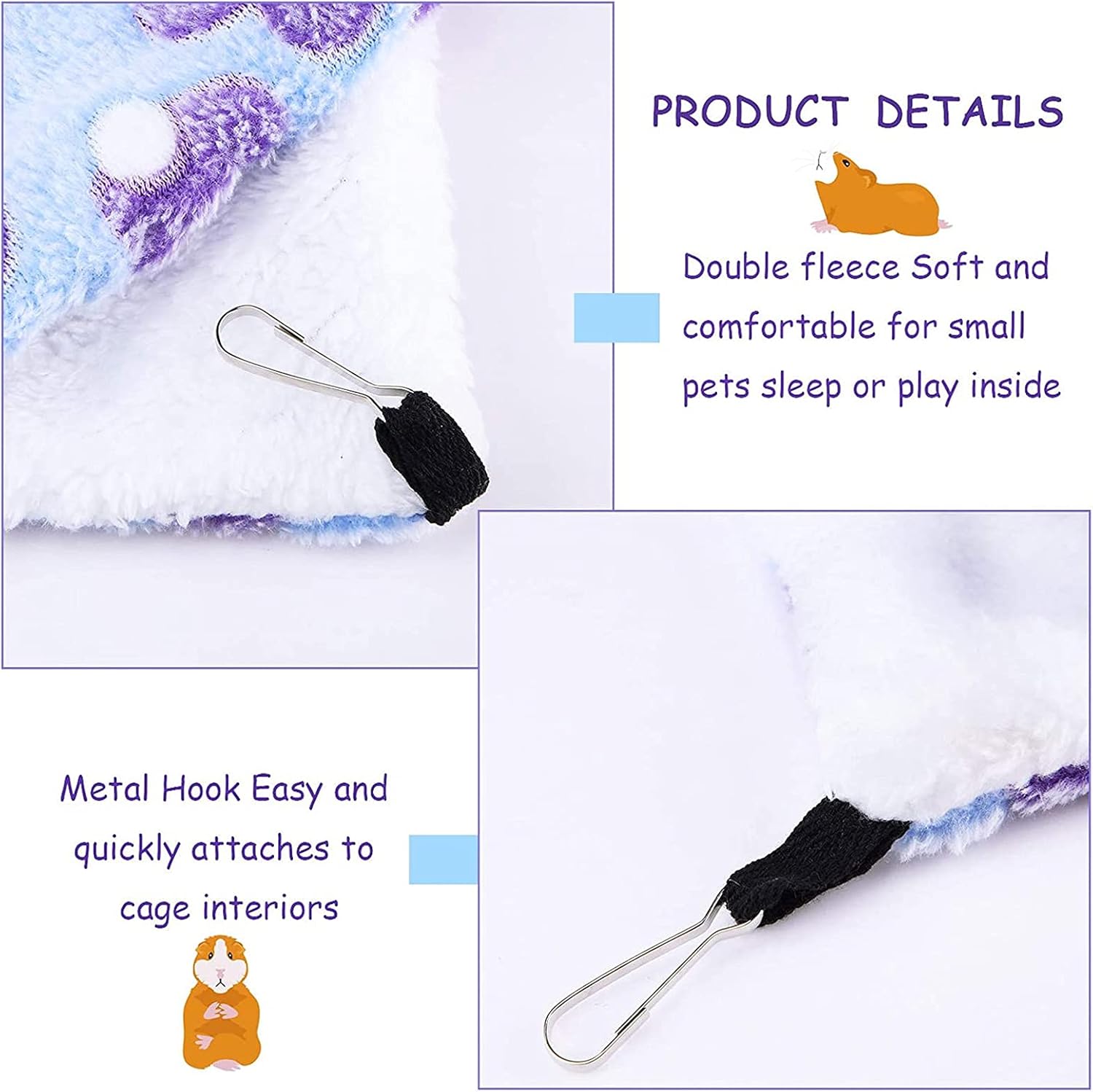 About this item Bunk bed design: the pet cage hanging hammock adopts 2-in-1 design for different options, your pets can either take a rest on the top layer or hide in the bottom layer; The design meets their instincts of running in the tunnel back and forth, mimicking their wild living environment, and providing them with a relaxed and comfy space Convenient to operate: the 4 corners of the hammocks are equipped with metal hooks linked with straps, which is designed to attach to the small pet cage, you can attach the hooks to the cage interiors with hooks easily and quickly Cute pets cage accessory: the hammock design can make full use of the large space of the pet cage; You can attach the pet hammock to the cage for saving space, while it can take the cage or your home out of the monotony, nice gifts for your beloved small animals, making them enjoyable Suitable for most small pets: the size of the soft hamster hammock is approx. 20 x 20 cm/ 7.87 x 7.87 inch, suitable size fits for most small animals, such as parrot, hamster, ferret, sugar glider, rats, guinea pig, squirrel and so on, giving them a safe resting spot Soft and cozy: made of coral fleece and arctic fleece, the pet hammock is soft, giving your pet a sense of warm and cozy feeling when sleeping or playing inside; It is washable and reusable, you can wash it by hand or washing machine; Please remove 4 hooks before laundering › See more product details